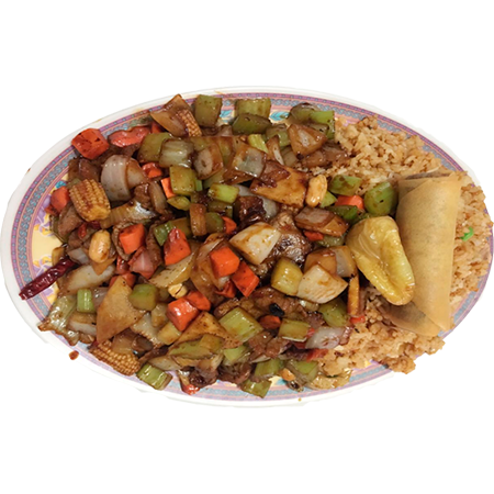 Pollo kung pao , Arroz frito con pollo, chun kun y chile asado.