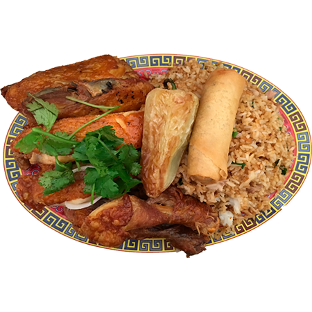 Pollo asado ,papas fritas, Arroz frito con pollo, chun kun y chile asado.