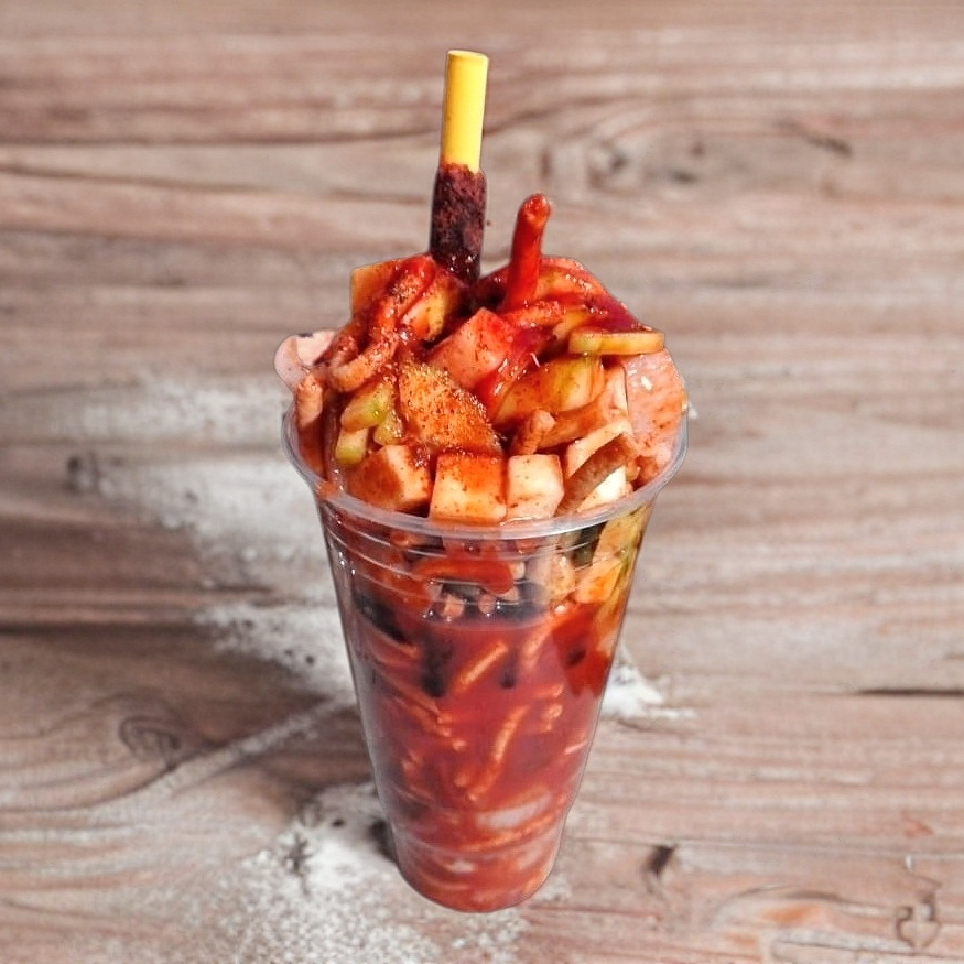 vaso de 16 onzas jícama, pepino, cuerito, cacahuate, chacachaca, tarugo de tamarindo, serpentina, chile, chamoy, tajín y clamato.