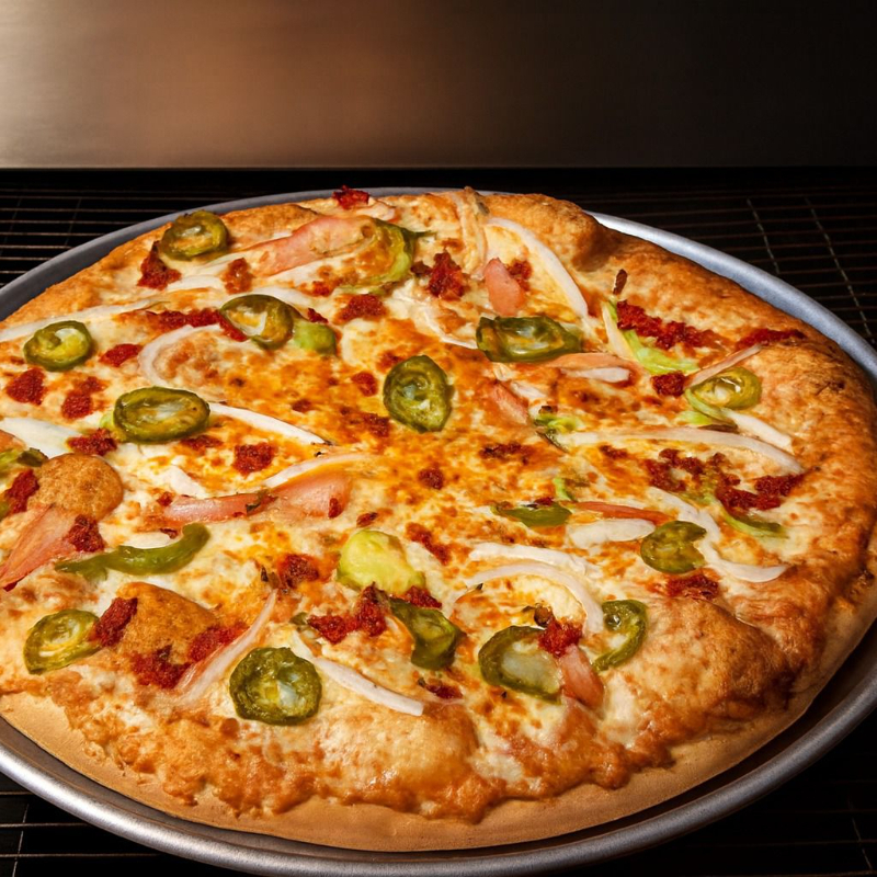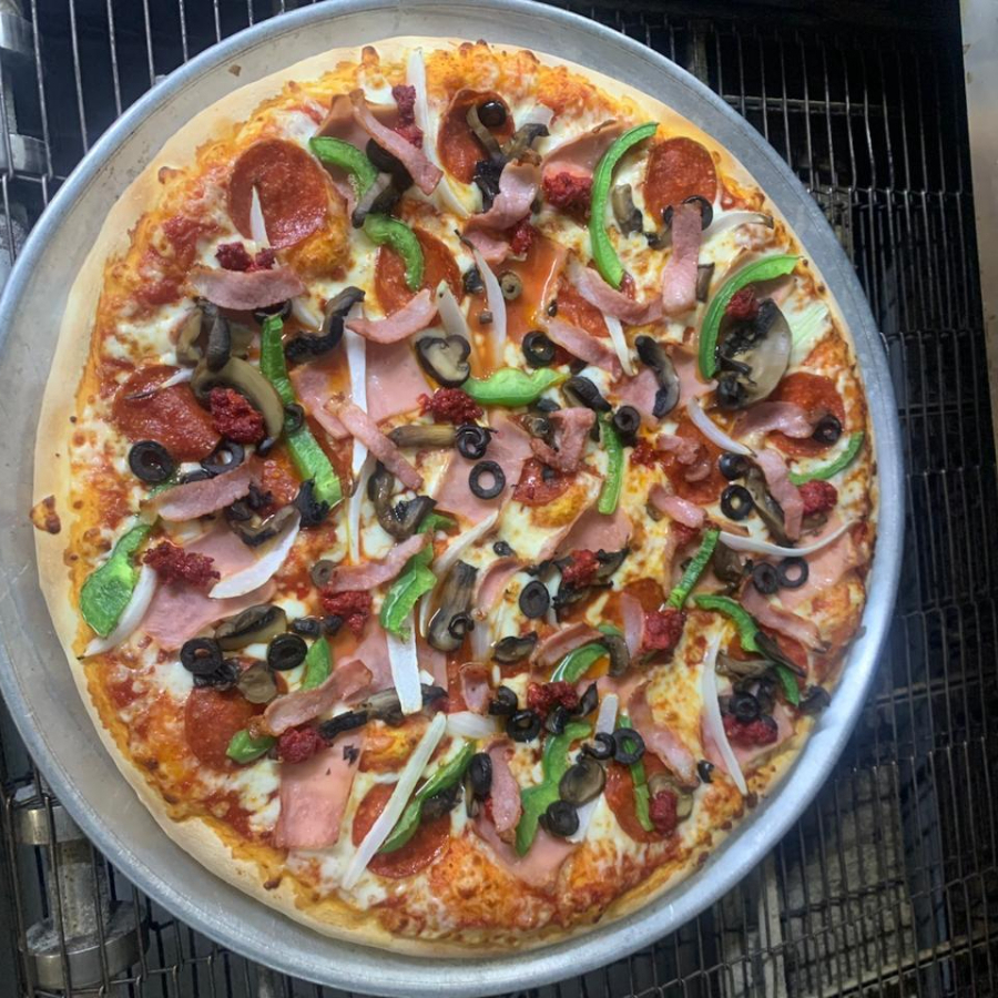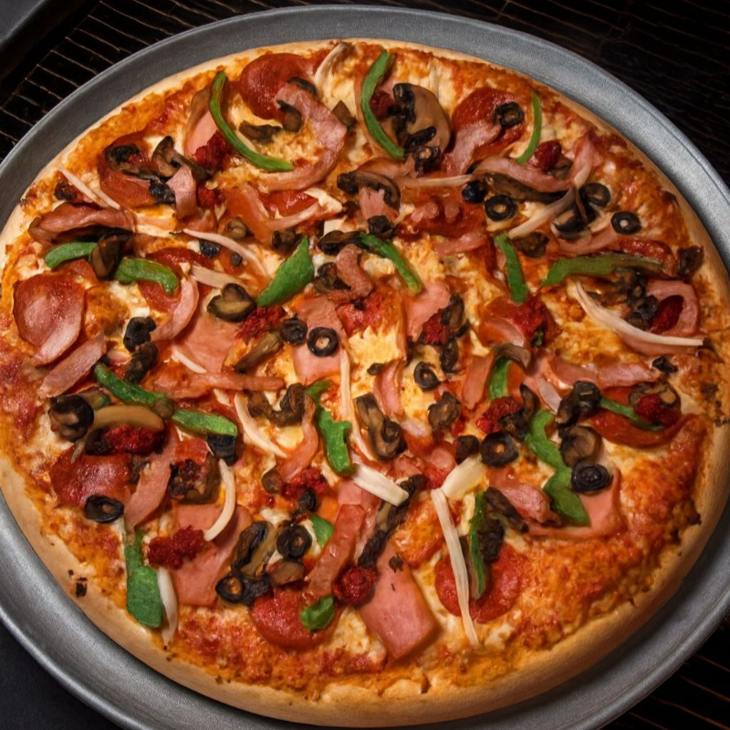 Nuestra pizza más completa mediana con pepperoni, champiñones, tocino, chorizo, jamón, morrón, aceitunas y cebolla.