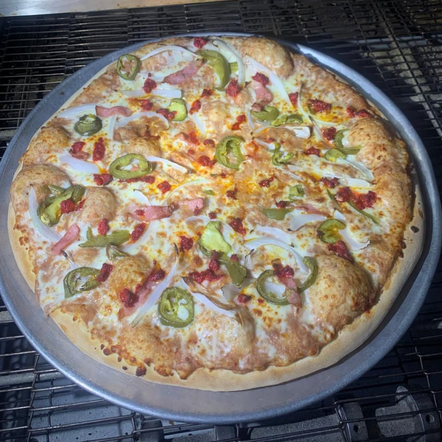 Toque picante mediano con tocino, chorizo, frijoles, cebolla y jalapeños.