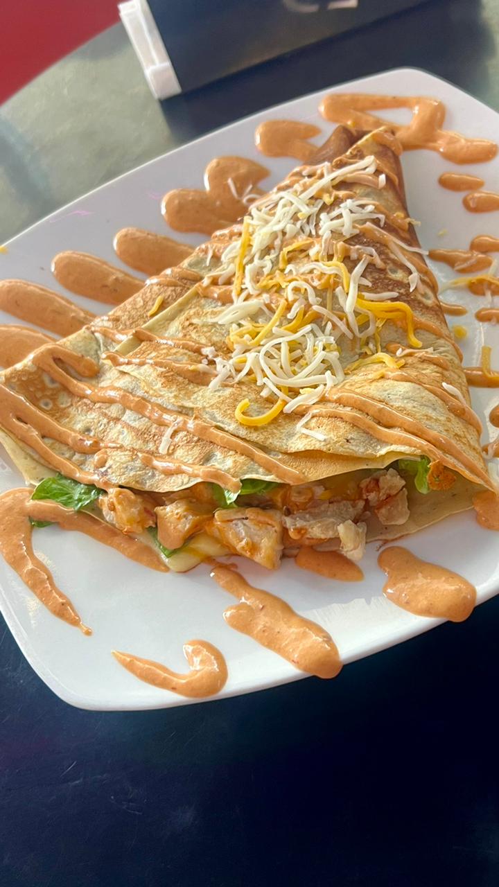 Deliciosa crepa rellena de queso manchego y mezcla de cheddar, pollo, lechuga romana y aderezo chipotle.