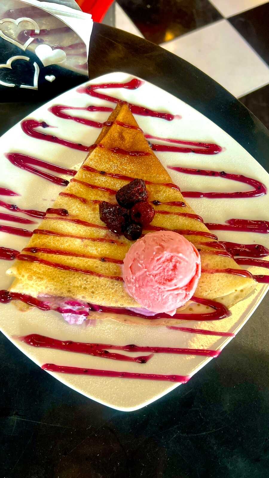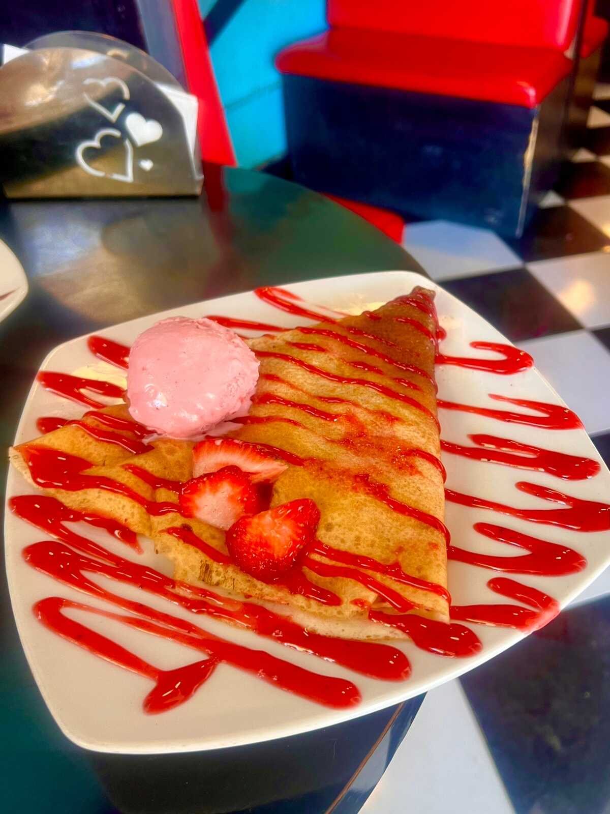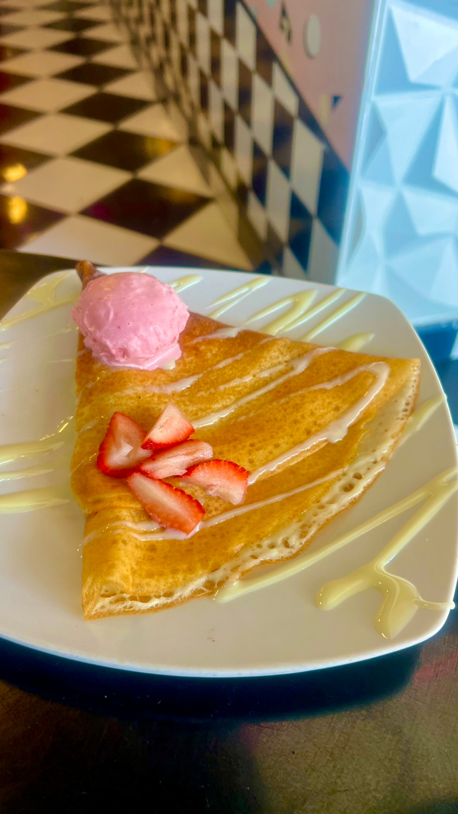 Deliciosa y esponjosa crepa rellena de queso crema, fresas dulces y frescas, decorada con Hershey's y azúcar glass.