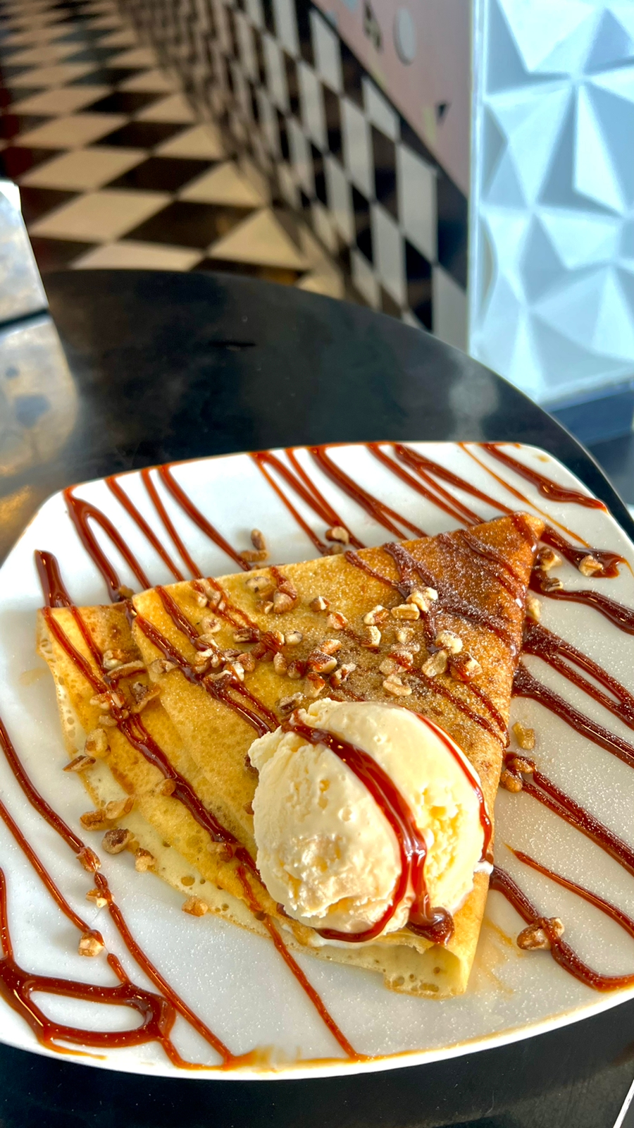 Deliciosa y esponjosa crepa, rellena de queso crema, cajeta y nuez decorada con un poco de azúcar glass.