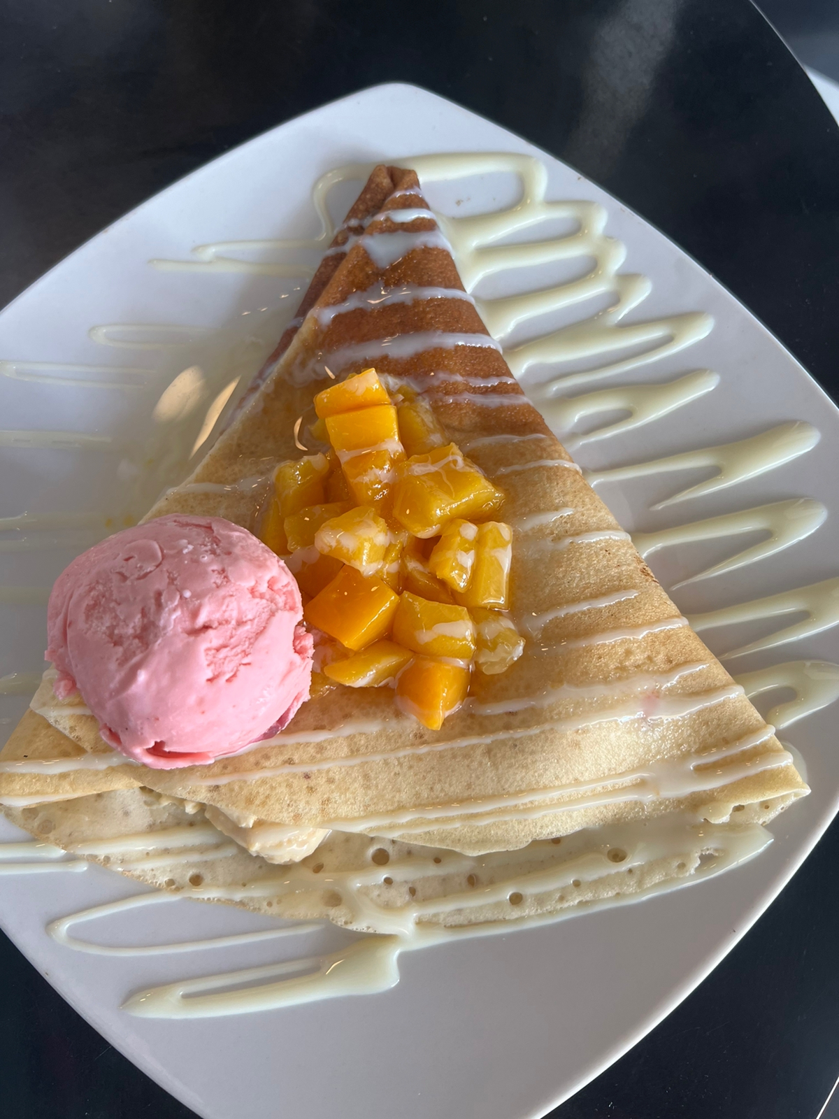 Deliciosa y esponjosa crepa rellena de queso crema, duraznos en almíbar y decorada con lechera y azúcar glass.