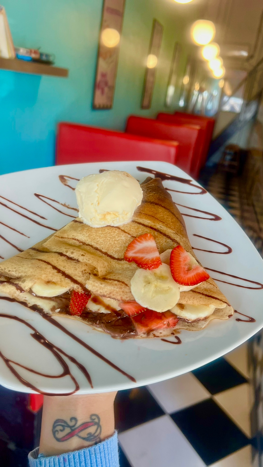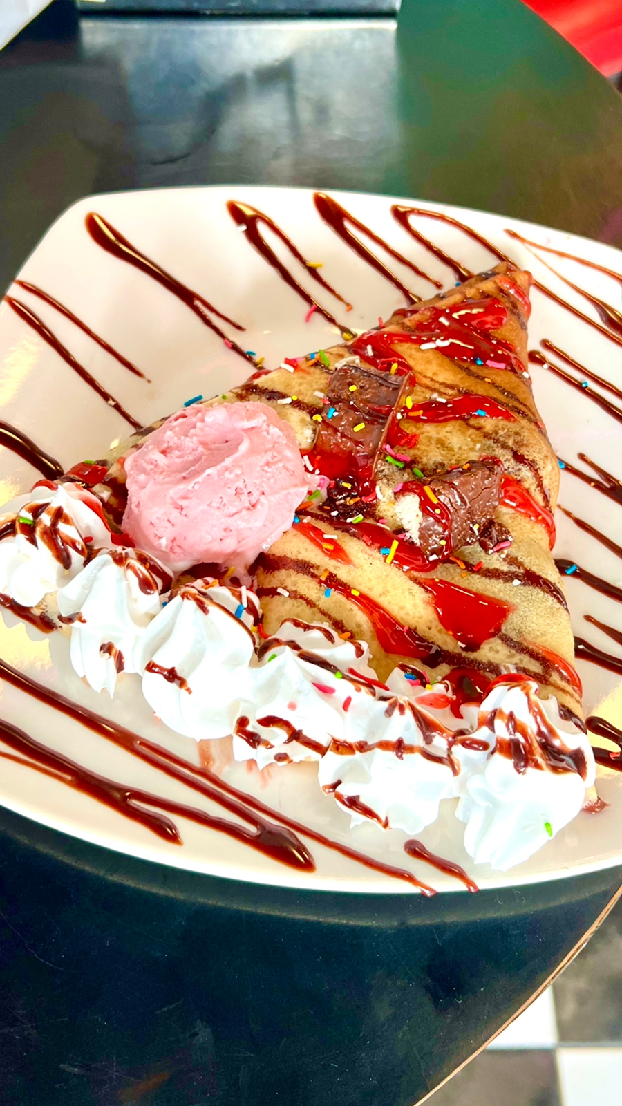 Deliciosa y esponjosa crepa rellena de autentica Nutella, fresas y plátano, decorada con chocolate Hershey's y un toque de azúcar glass.