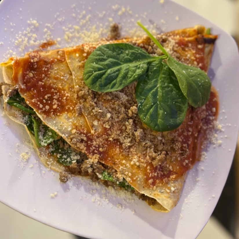 Deliciosa crepa rellena de salsa de tomate,carne molida,mezcla de quesos,espinacas y queso parmesano