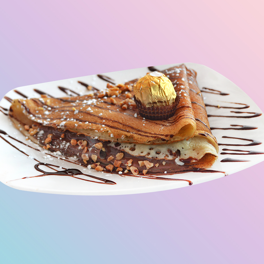 Dulce y deliciosa crepa rellena de Nutella con auténticos chocolates Ferrero, cacahuate y decorada con chocolate Hershey's y Ferrero.