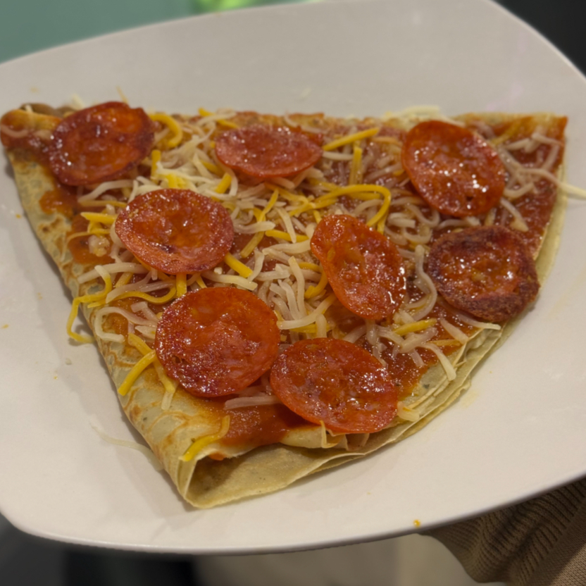Deliciosa crepa rellena de salsa de tomate,mezcla de quesos y pepperonis
