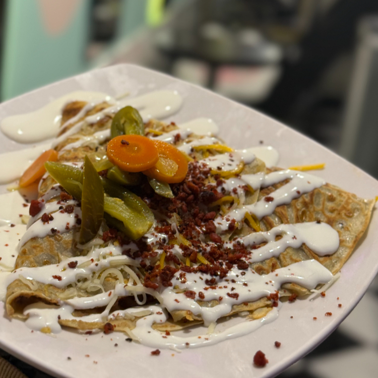 Deliciosa crepa rellena de mezcla de queso cheddar,frijoles refritos,chorizo y decorada con crema ácida y chiles jalapeños.