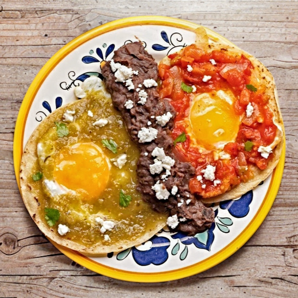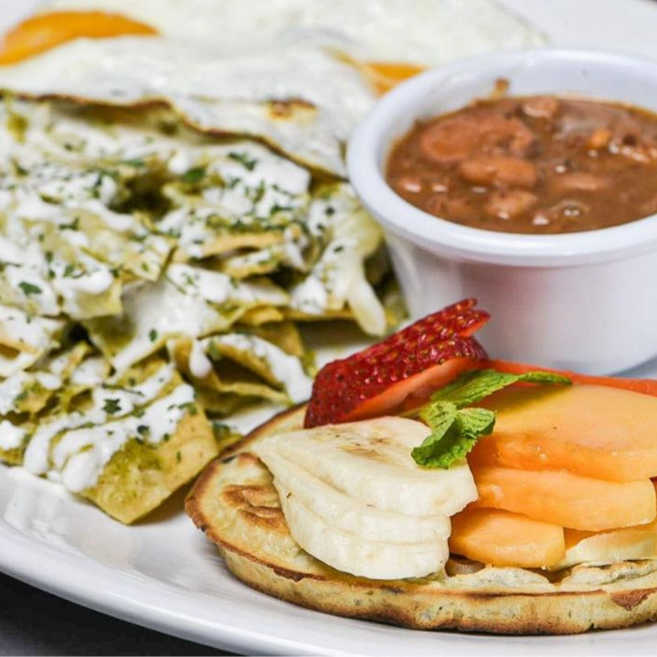 Chilaquiles Rojos o Verdes,con frijol,waffle,frutas y miel