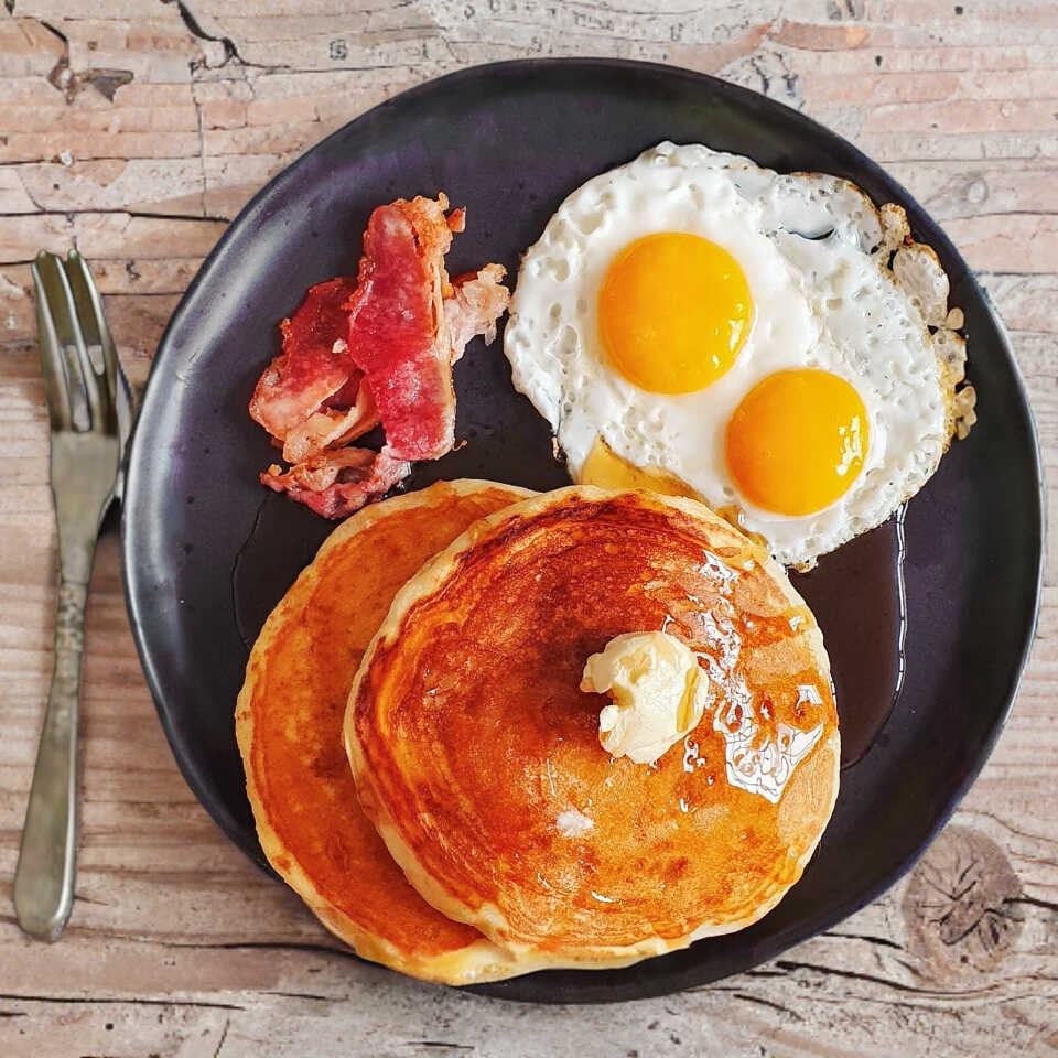2 huevos, 2 hot cakes y 2 tiras de tocino