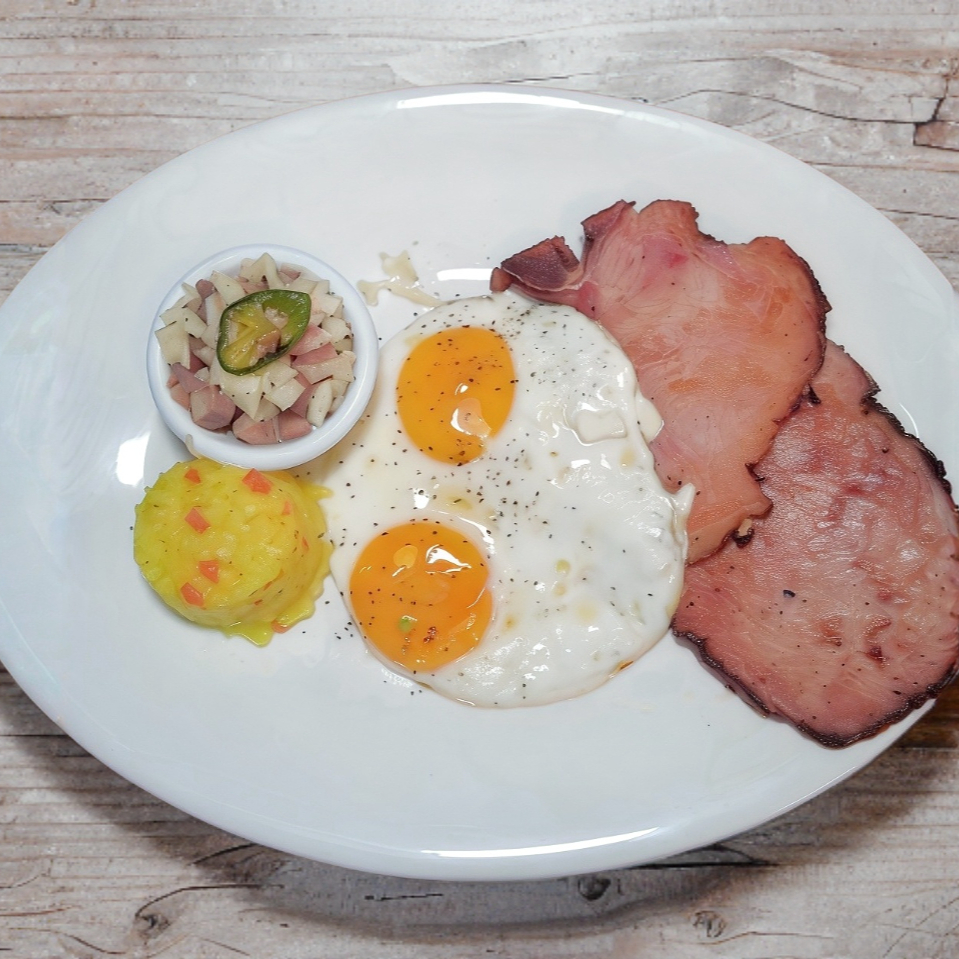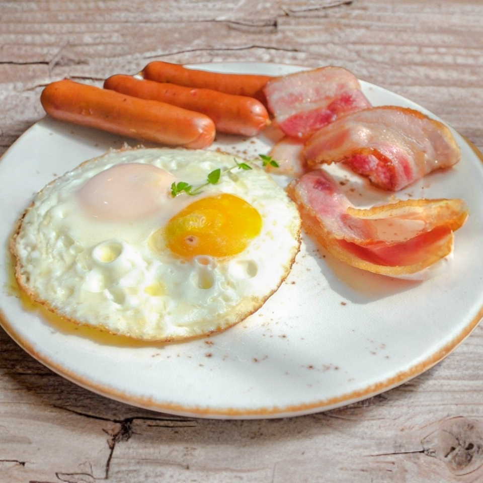 2 huevos, 2 tiras de tocino y 2 salchichas doradas en rebanadas