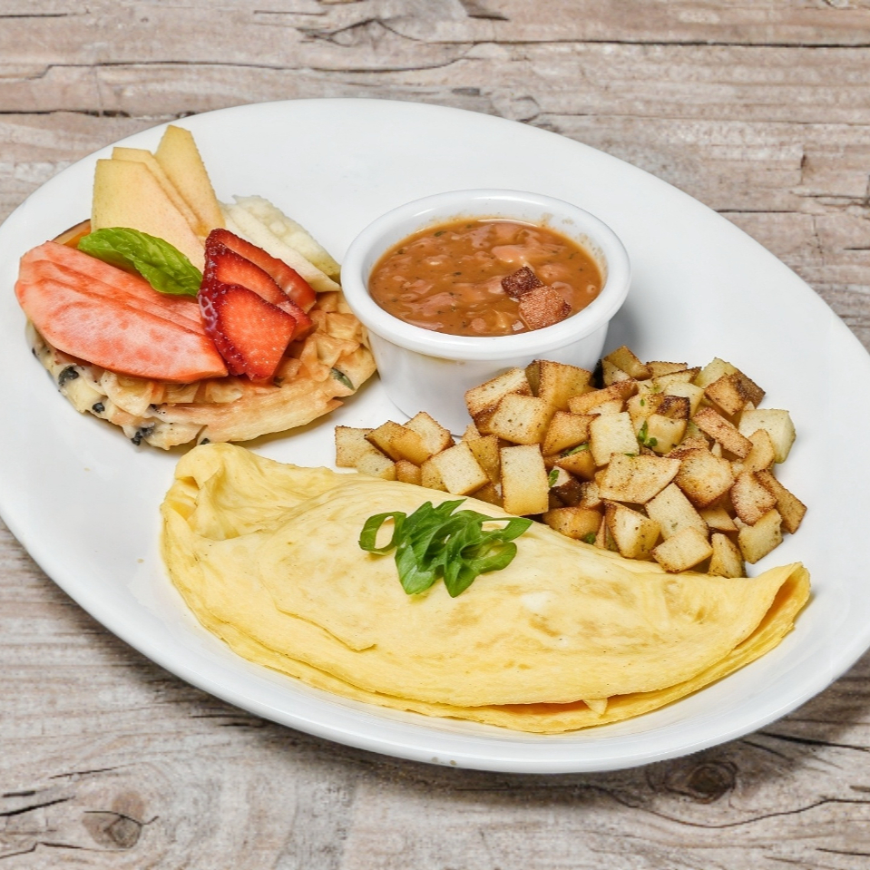 Omelette de huevo con max 3 ingredientes, waffle y mantequilla o miel