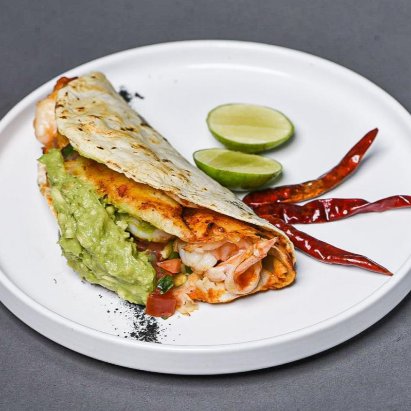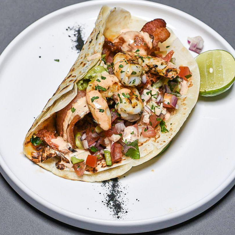 En tortilla de Maíz o Harina,guisado de Marlin ,Camarones cocidos,queso y Tocino