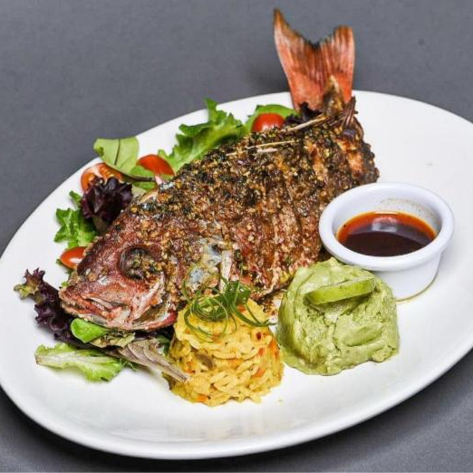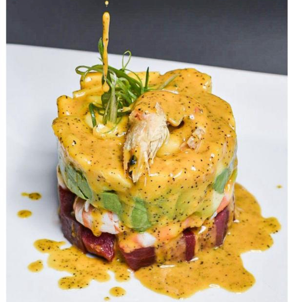 Cubos de Atún,camarón cocido, aguacate y trozos de mango bañada en una Salsa de Maracuyá y chile Habanero tatemado