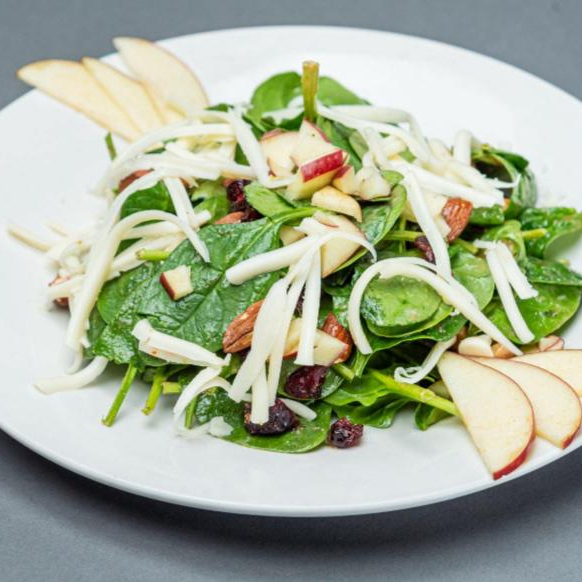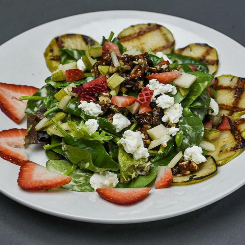 Espinacas,Mix de Lechugas,pera asada,nuez caramelizada,queso panela y fresa