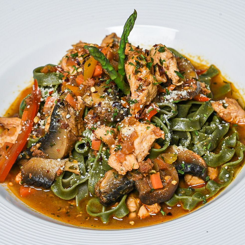 Pasta artesanal de espinacas en crema con camarones,pollo y champiñones