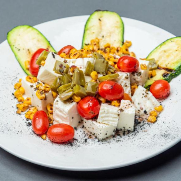 Cubos de Panela,granos de elote,nopal,tomates cherry y calabazas asadas