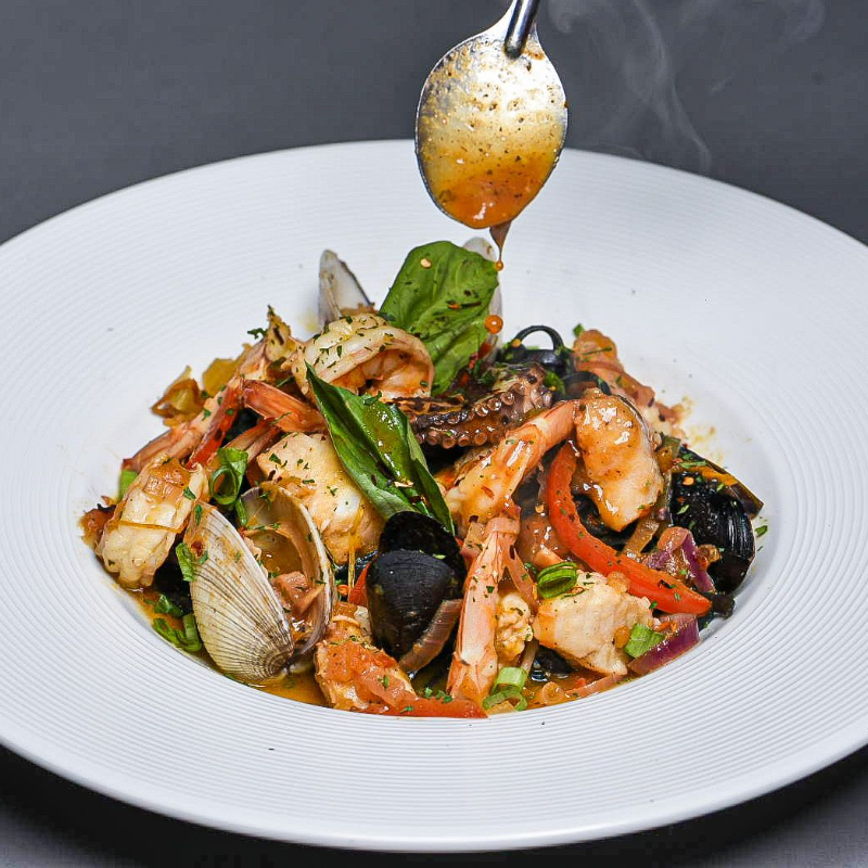 Pasta Artesanal con Mariscos Surtidos con salsa de tomate y reducción de Vino Blanco