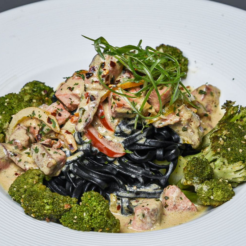 Pasta artesanal en tinta de calamar, con salmón,morrones rojos,champiñones,vino blanco y crema acompañado de brócoli