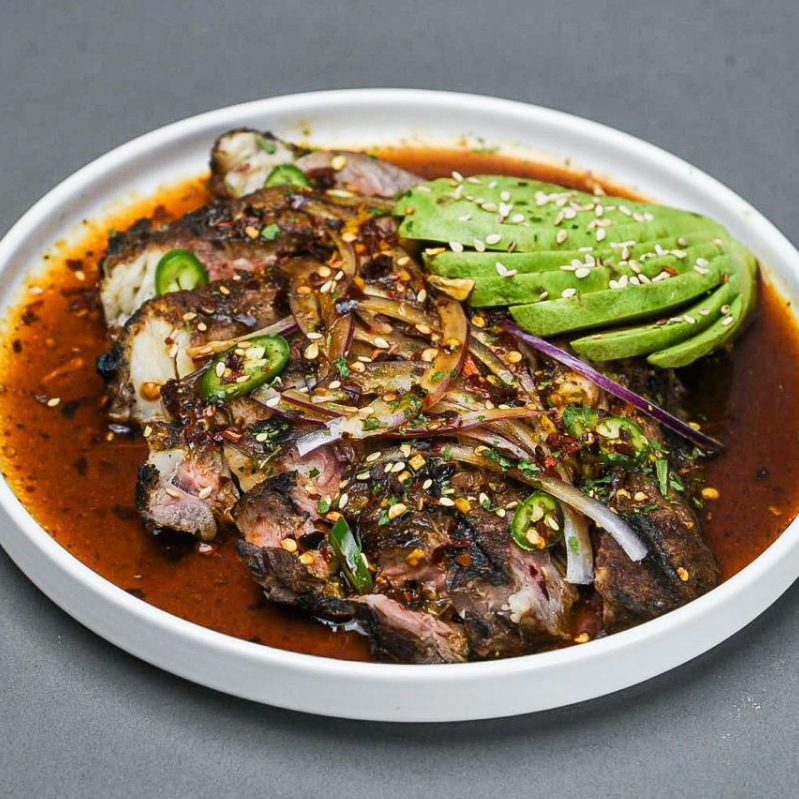 300 gr Ribeye, bañado en sabrosa y picosita salsa acompañado de abanico de aguacate