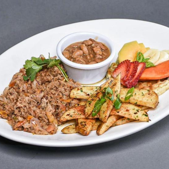 Con papas sazonadas,frijol,waffle,frutas,mantequilla y miel