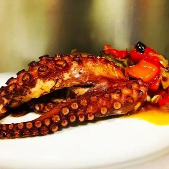 Pulpo a las brazas taremado con una salsa pesto de pesto con pistache y nueces asadas acompañado de pure