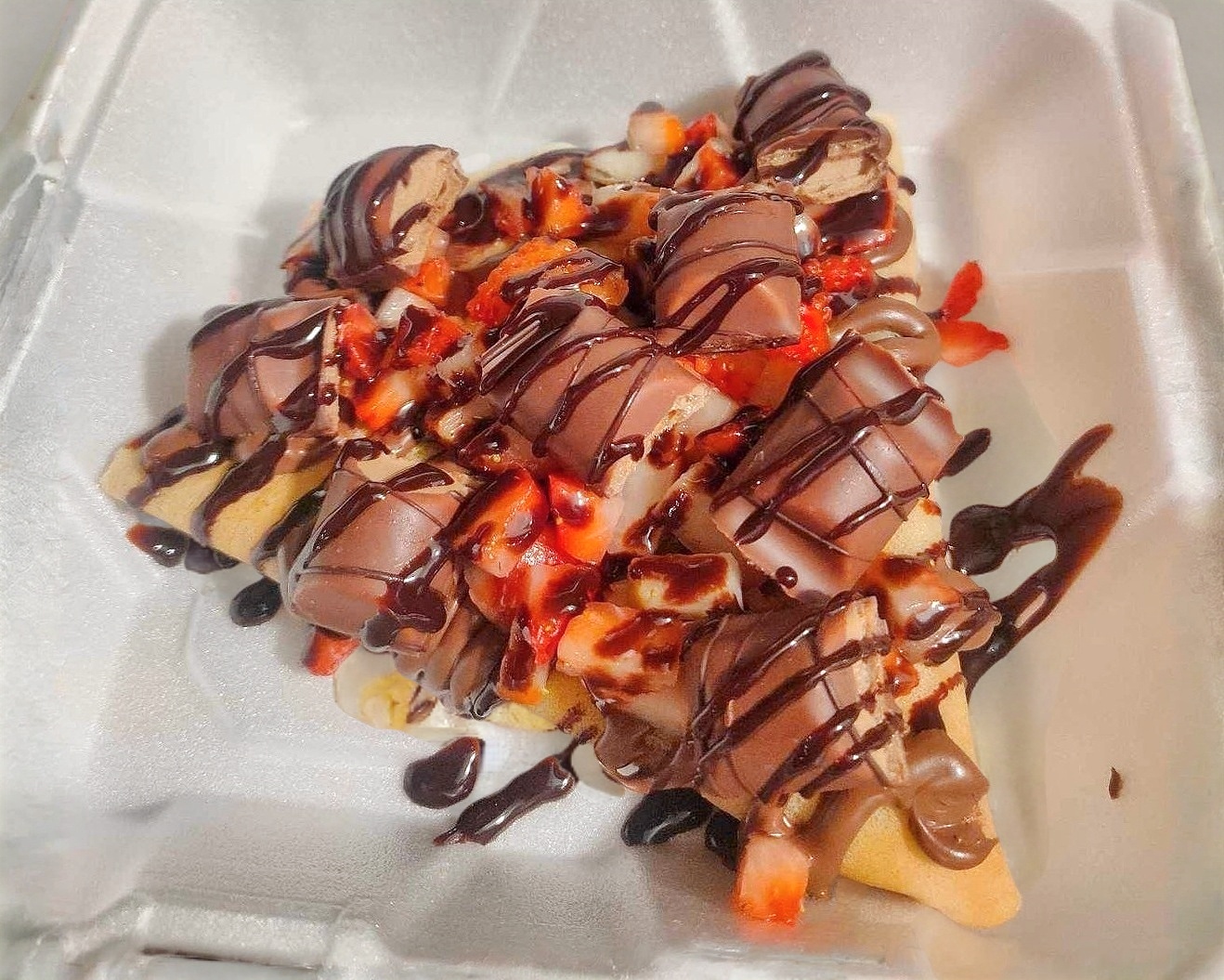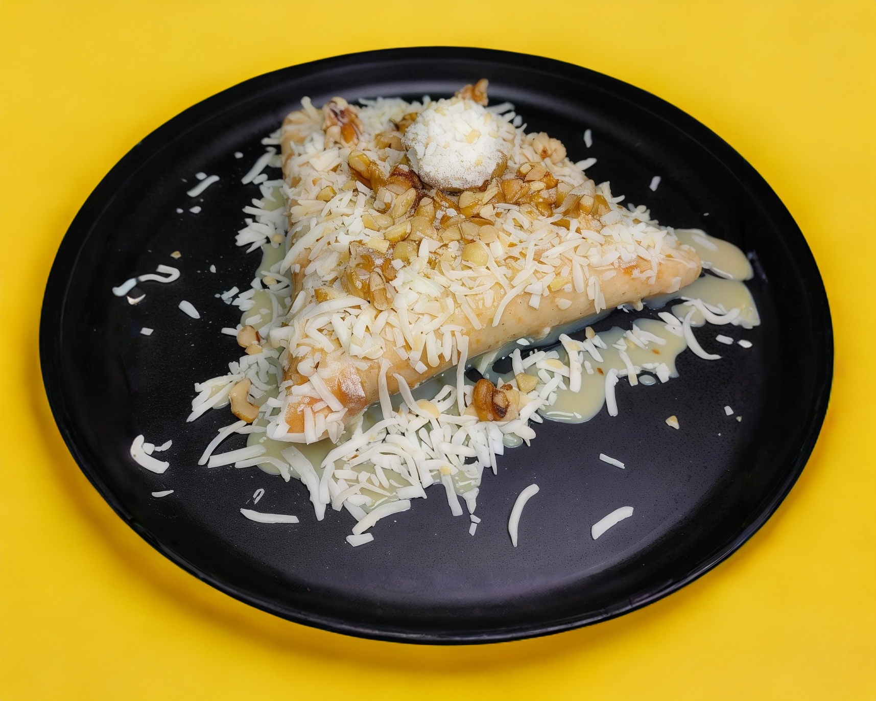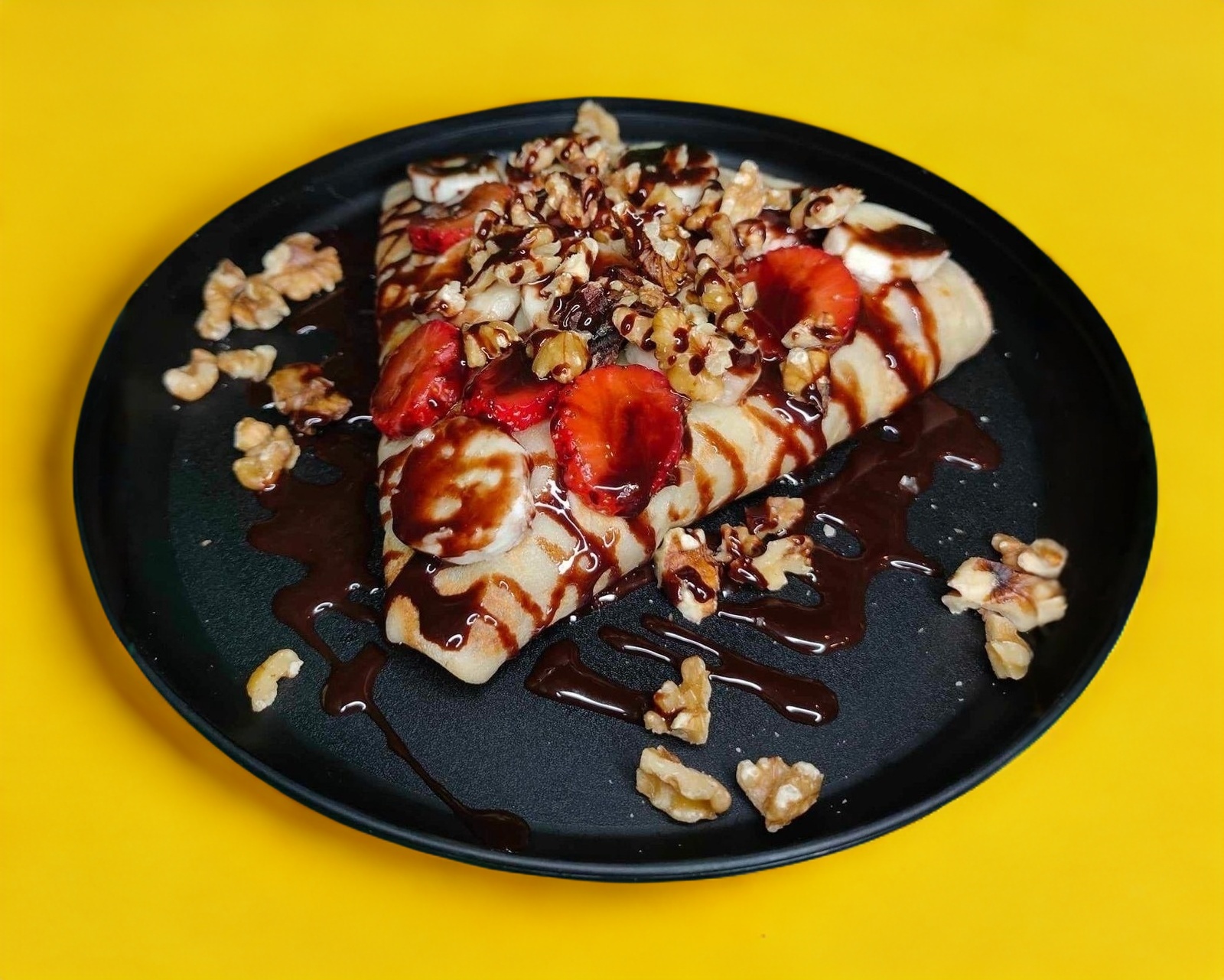 Base de Nutella rellena con plátano, fresa, chocolate y nuez.