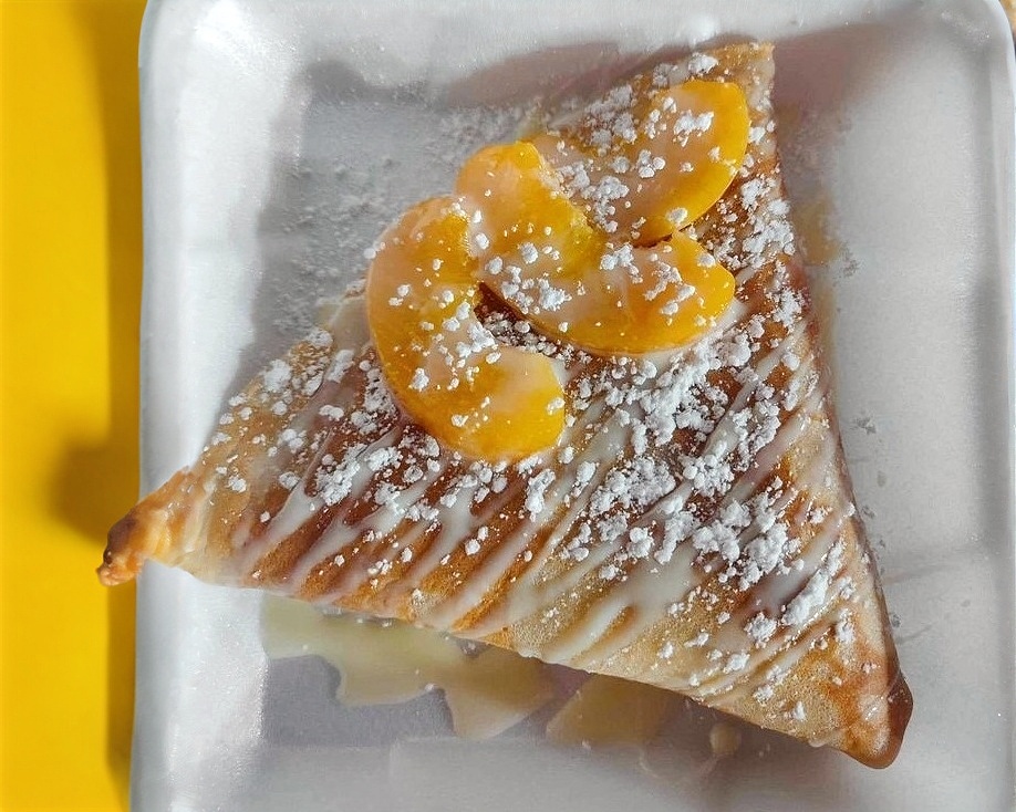 Base de queso crema con durazno en almíbar, Lechera y crema batida.