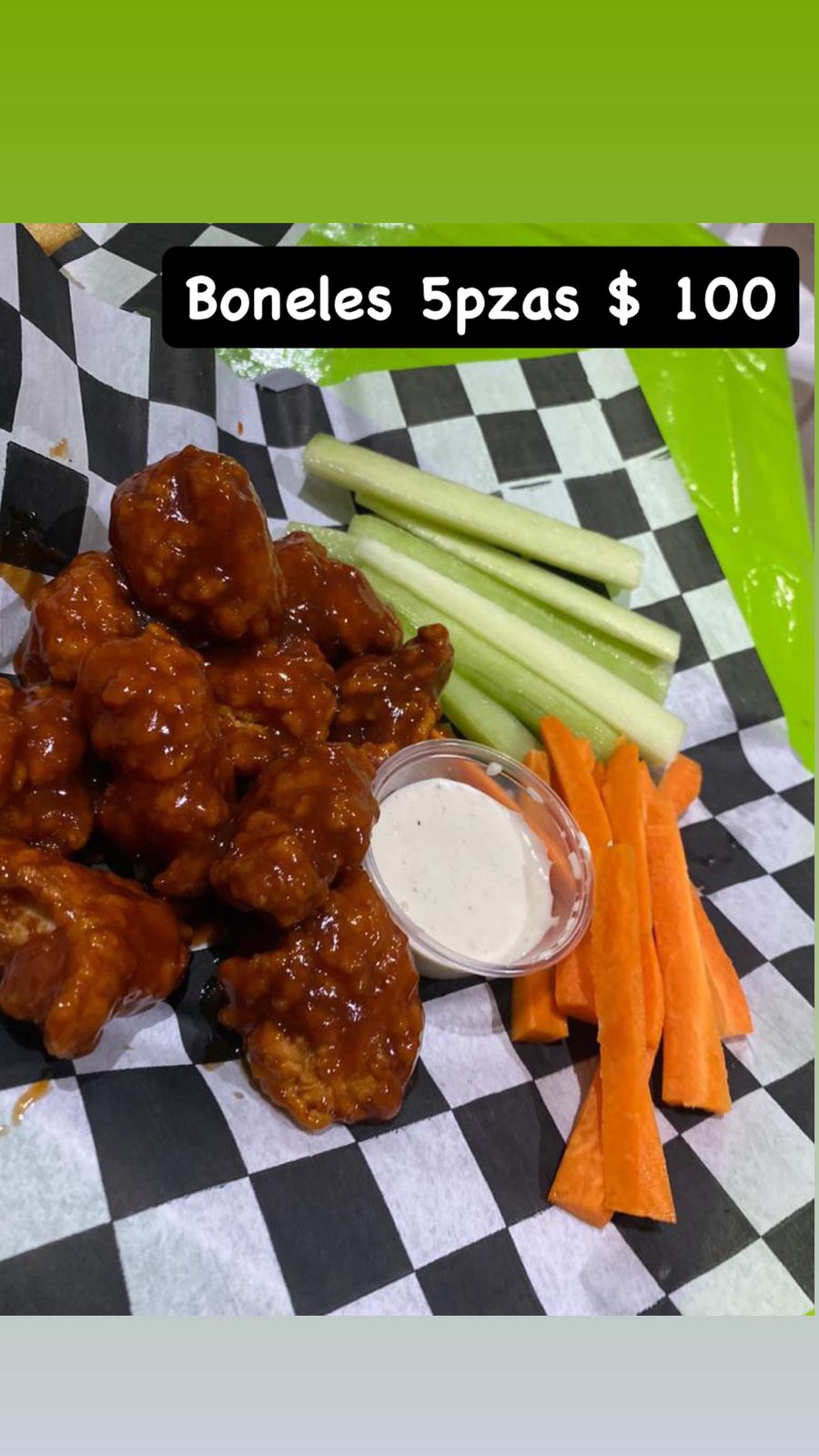 Deliciosa porción de 10 boneless, acompañados de una cremoso aderezo ranch, y servidos con una guarnición fresca de apio y zanahoria.