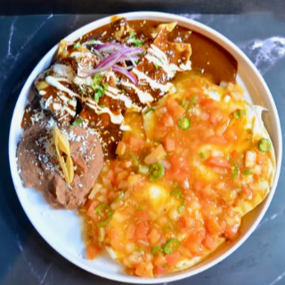 Bañados en salsa ranchera, huevos montados en dos tortillas fritas. Acompañado de chilaquiles y frijoles.