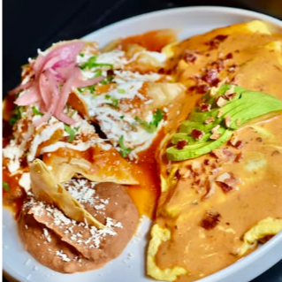 Omelette con 2 vegetales a elegir, queso Monterrey y coronado con aguacate. Acompañado de chilaquiles y frijoles.