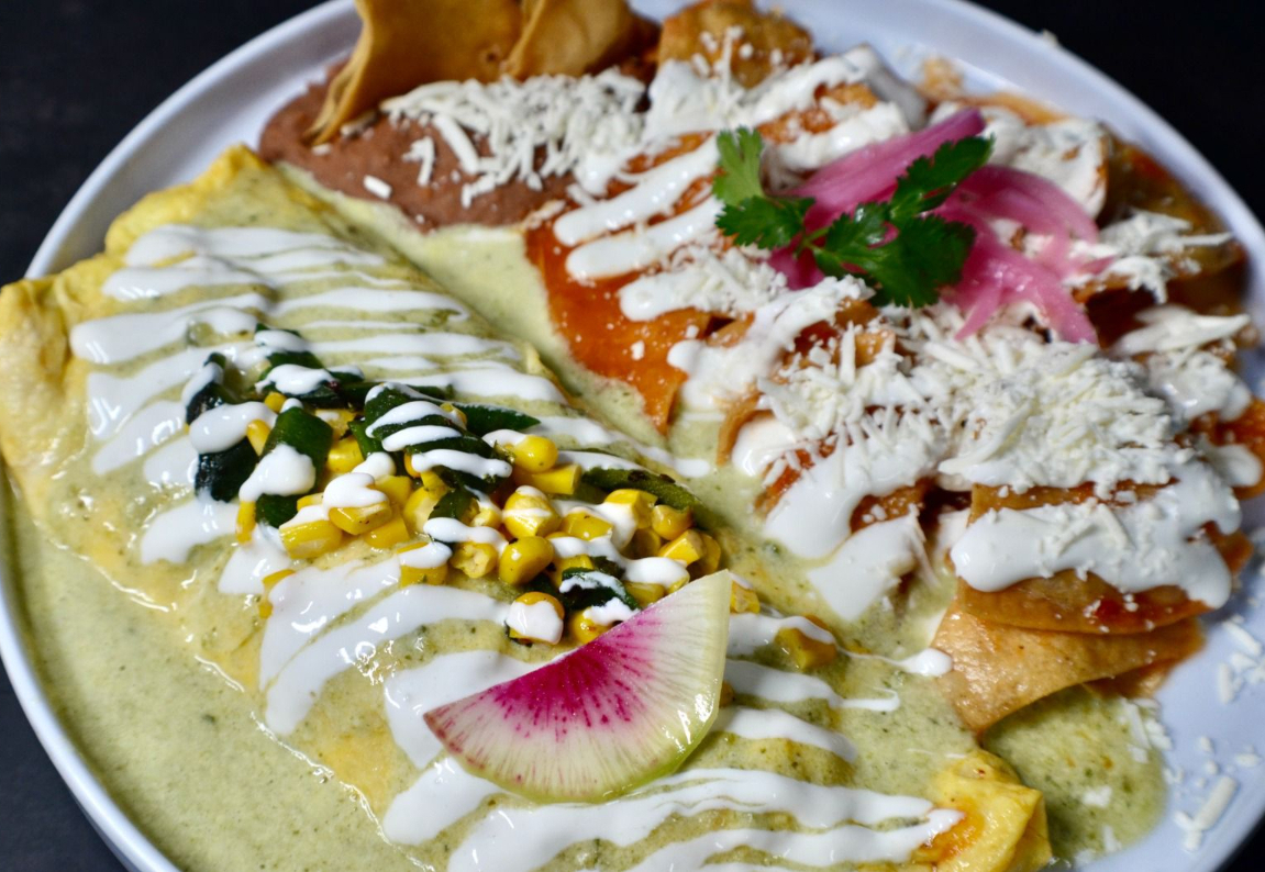 Rajas poblanas, elote, queso Monterrey y bañado en salsa poblana. Acompañado de chilaquiles y frijoles.