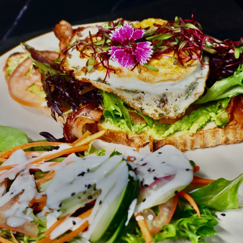 Rebanada de pan tostado con mix de lechugas, aguacate, 1 huevo al gusto, 2 tiras de tocino y salsa macha. Acompañado de fruta de temporada.