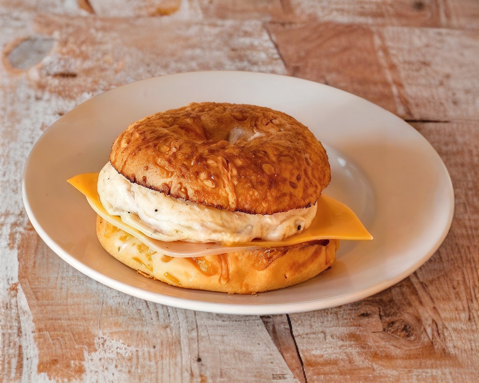 Bagel natural, huevo, jamon, queso americano y queso crema