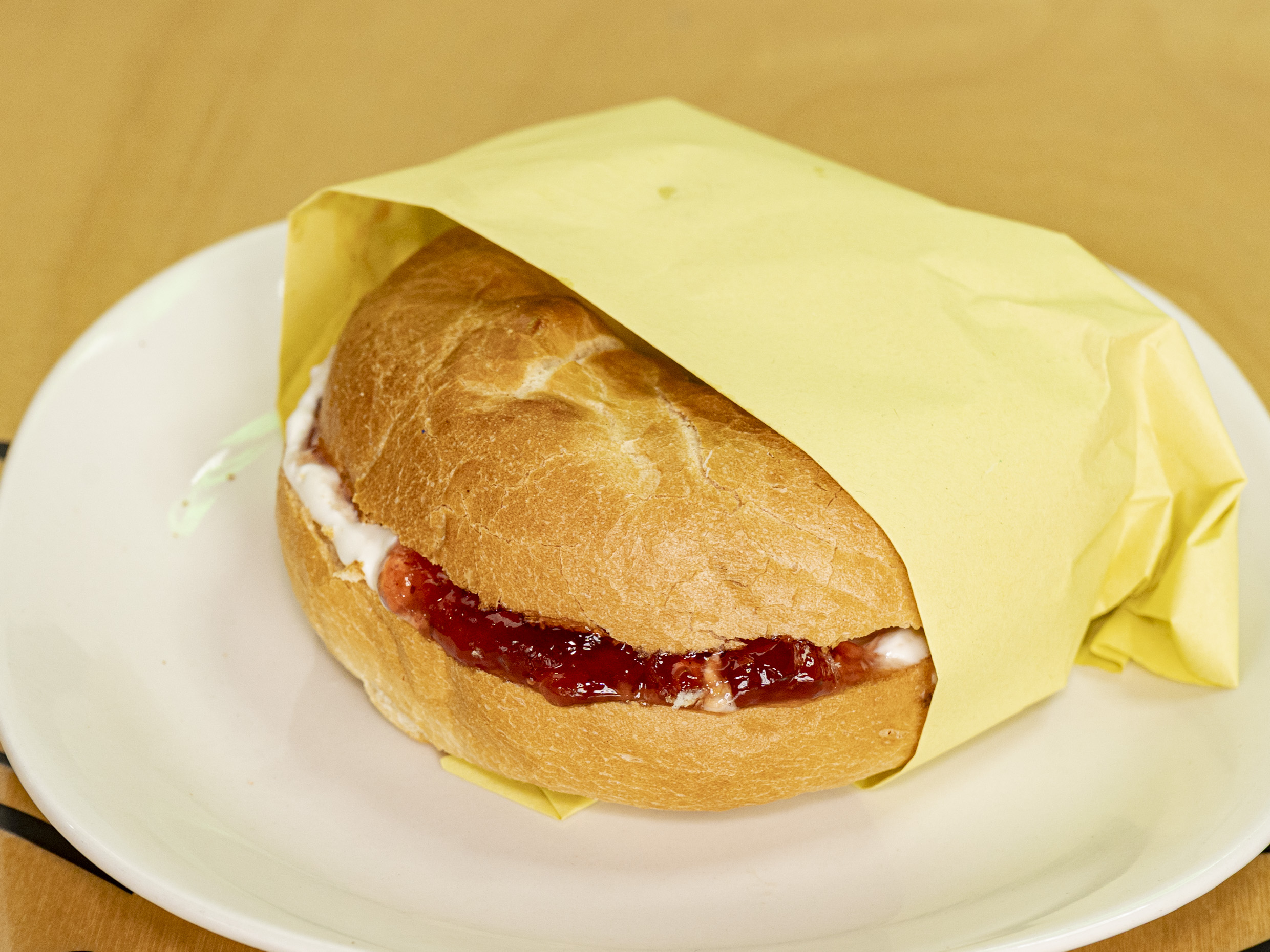 Bagel natura con queso crema y mermelada de fresa