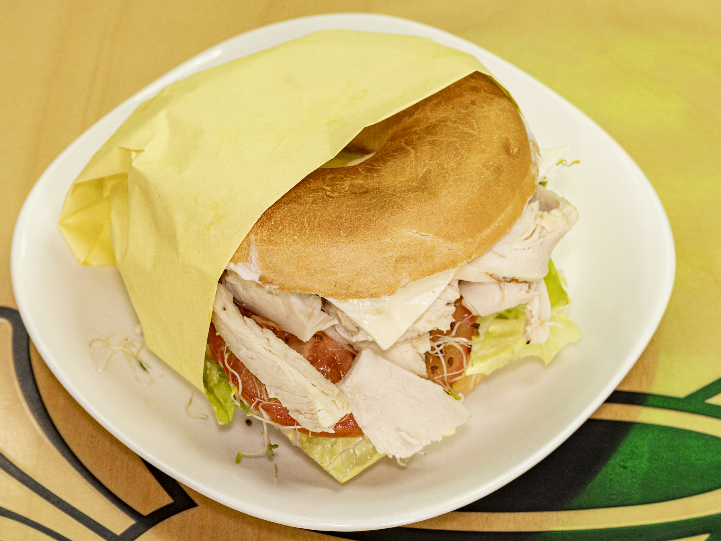 Bagel natural, jamon de pavo, tomate, lechuga, alfalfa, queso crema y queso blanco