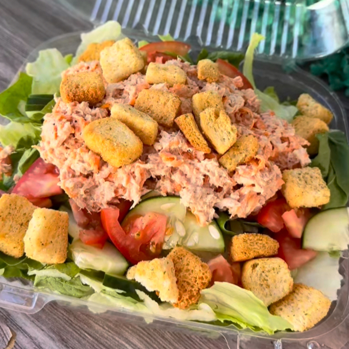 Lechuga mixta, tomate, pepino, crotones, atun preparado con mayonesa y zanahoria rayada