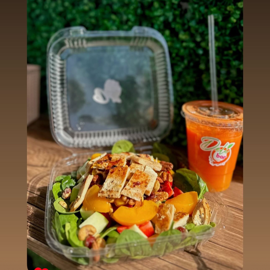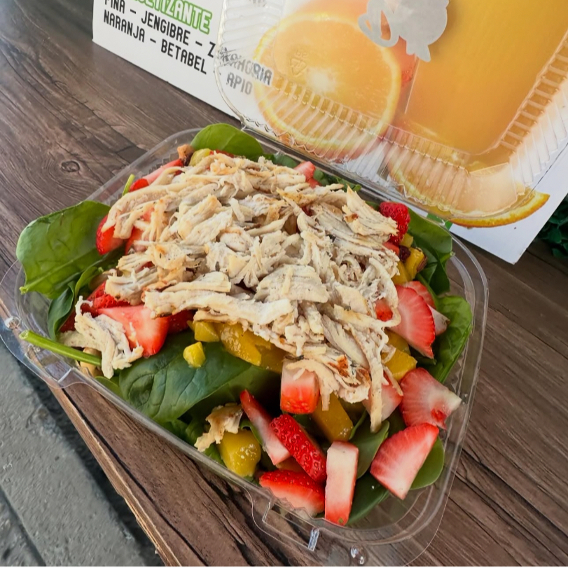 Espinacas, fresas, manzana verde, arándanos, duraznos en almíbar, nueces, pechuga de pollo