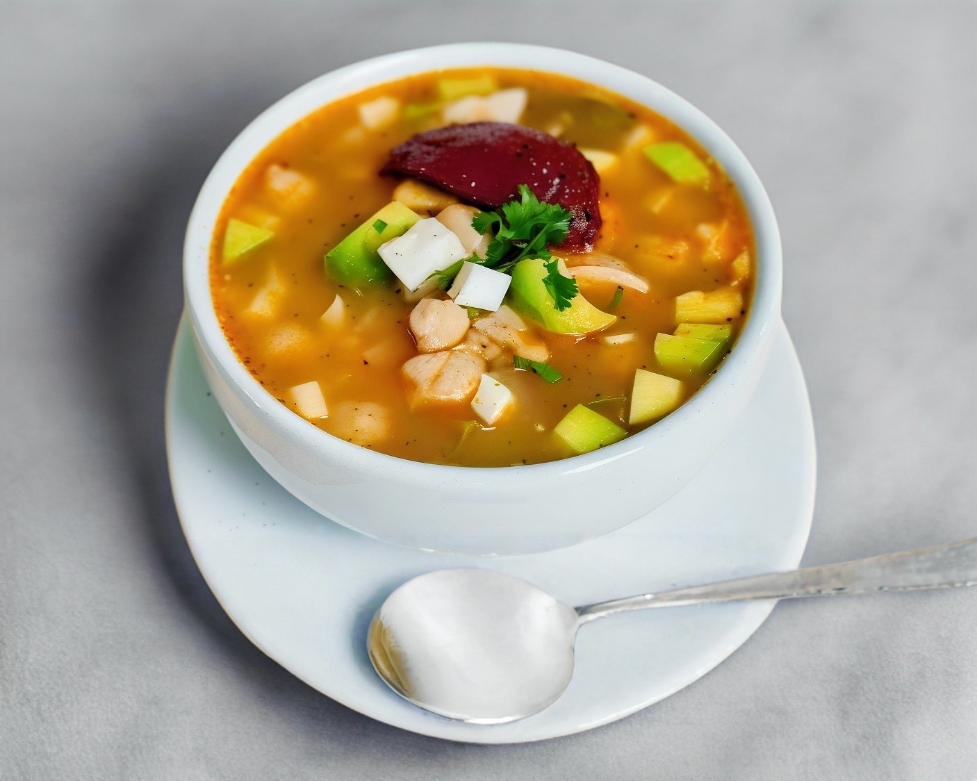 Pechuga de pollo, calabaza, zanahoria, chayote, chipotle, aguacate, queso monterrey y garbanzo.