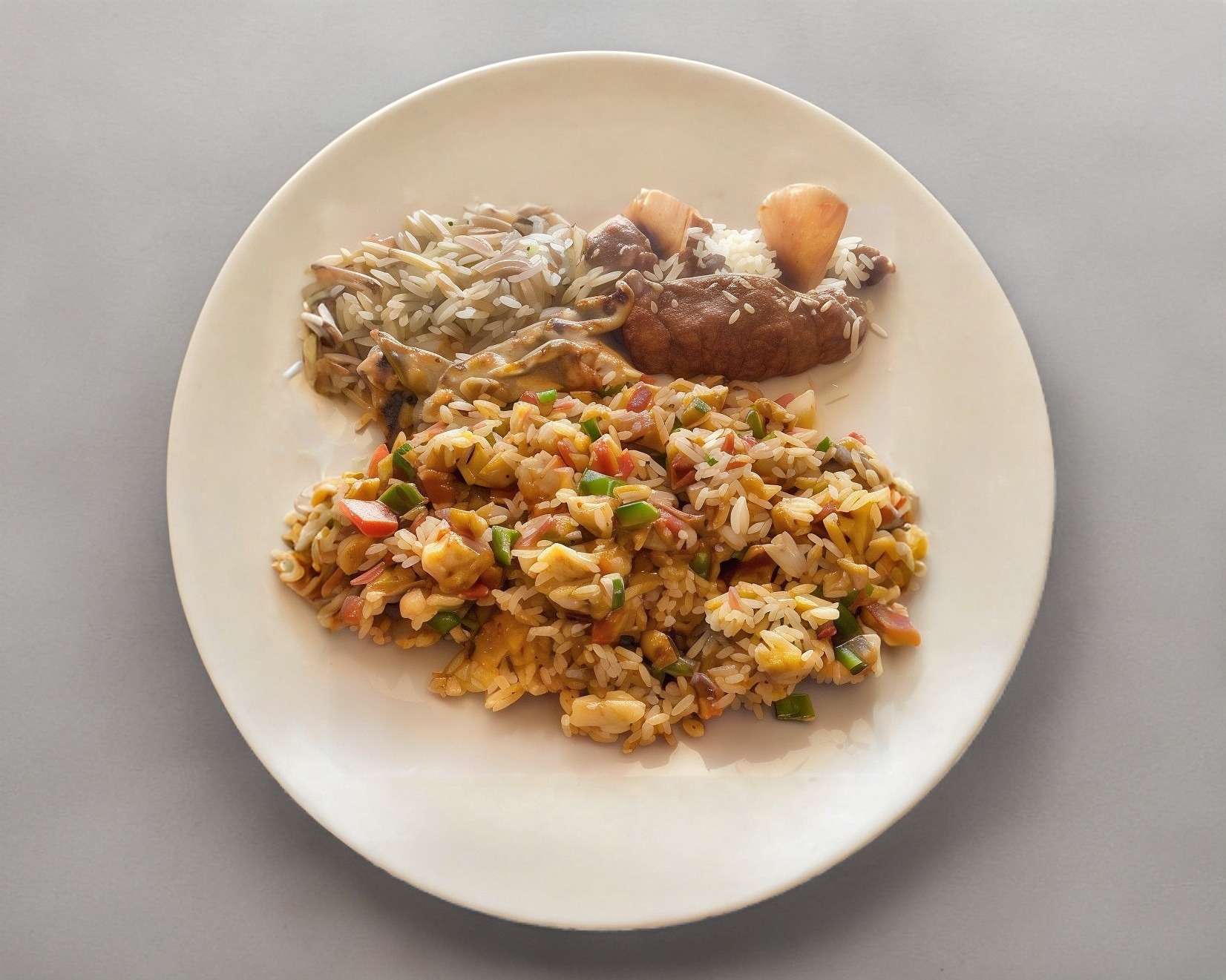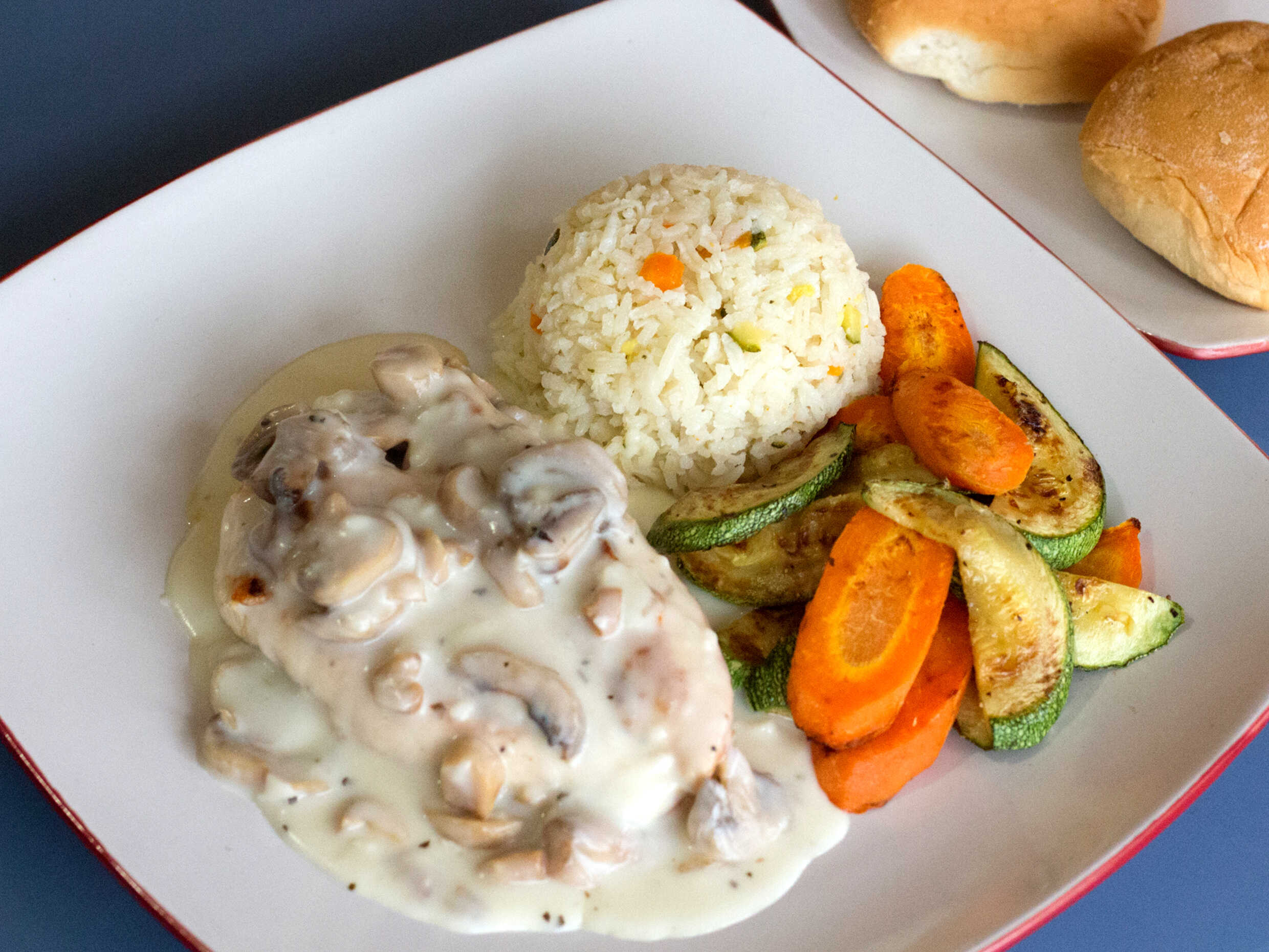 Pechuga de pollo, arroz, calabaza, zanahoria, chayote, condimento con aregano fresco.