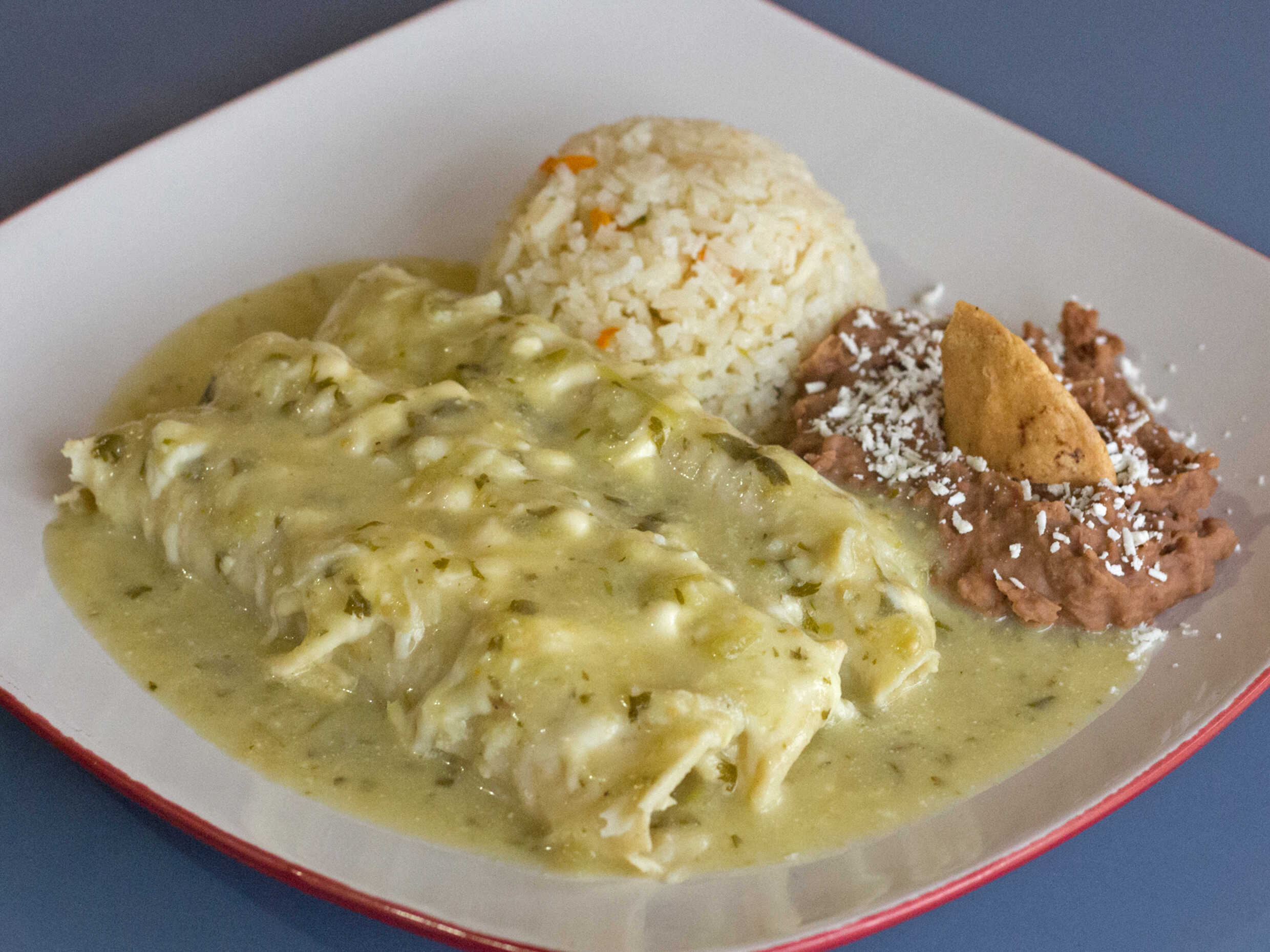 Con tomate, cebolla y chile poblano. Acompañado de frijol y arroz.