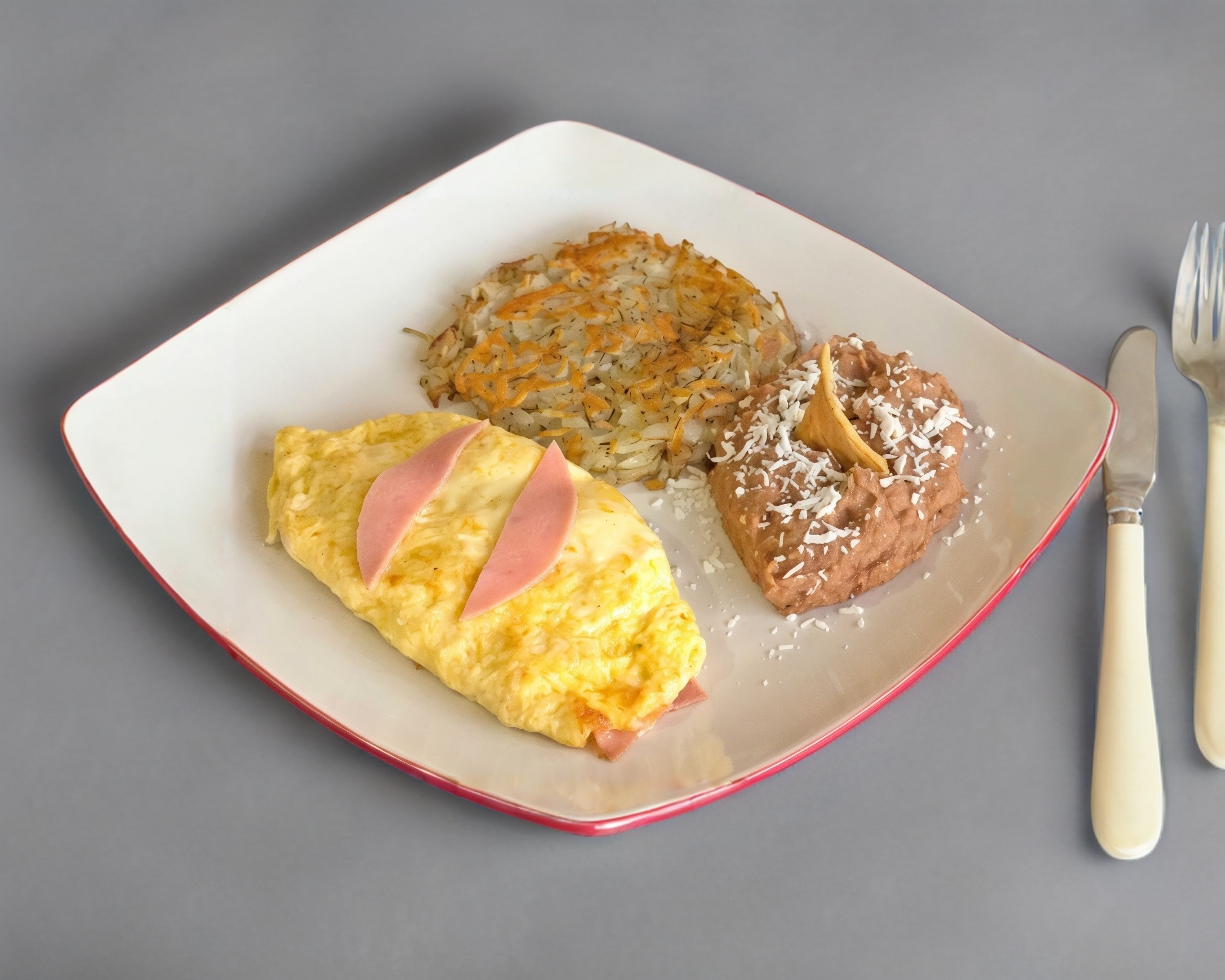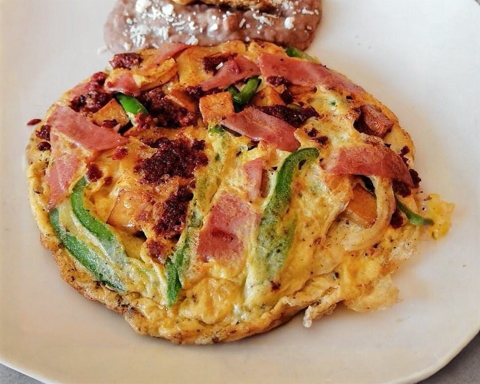 Huevo con chorizo, jamon papa y chile, con frijol.
