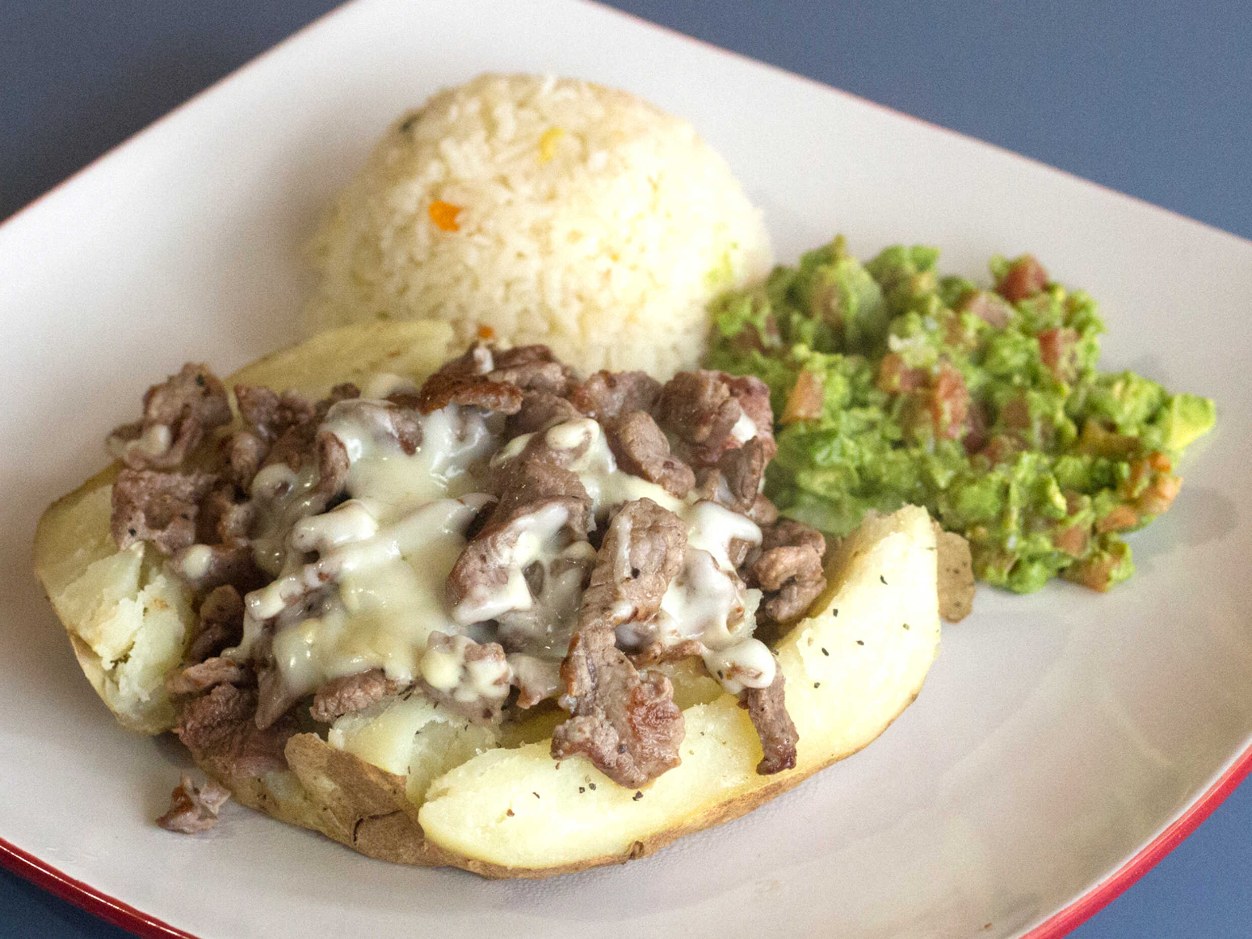 Bañado en salsa de Chipotle con papa, arroz y frijol.