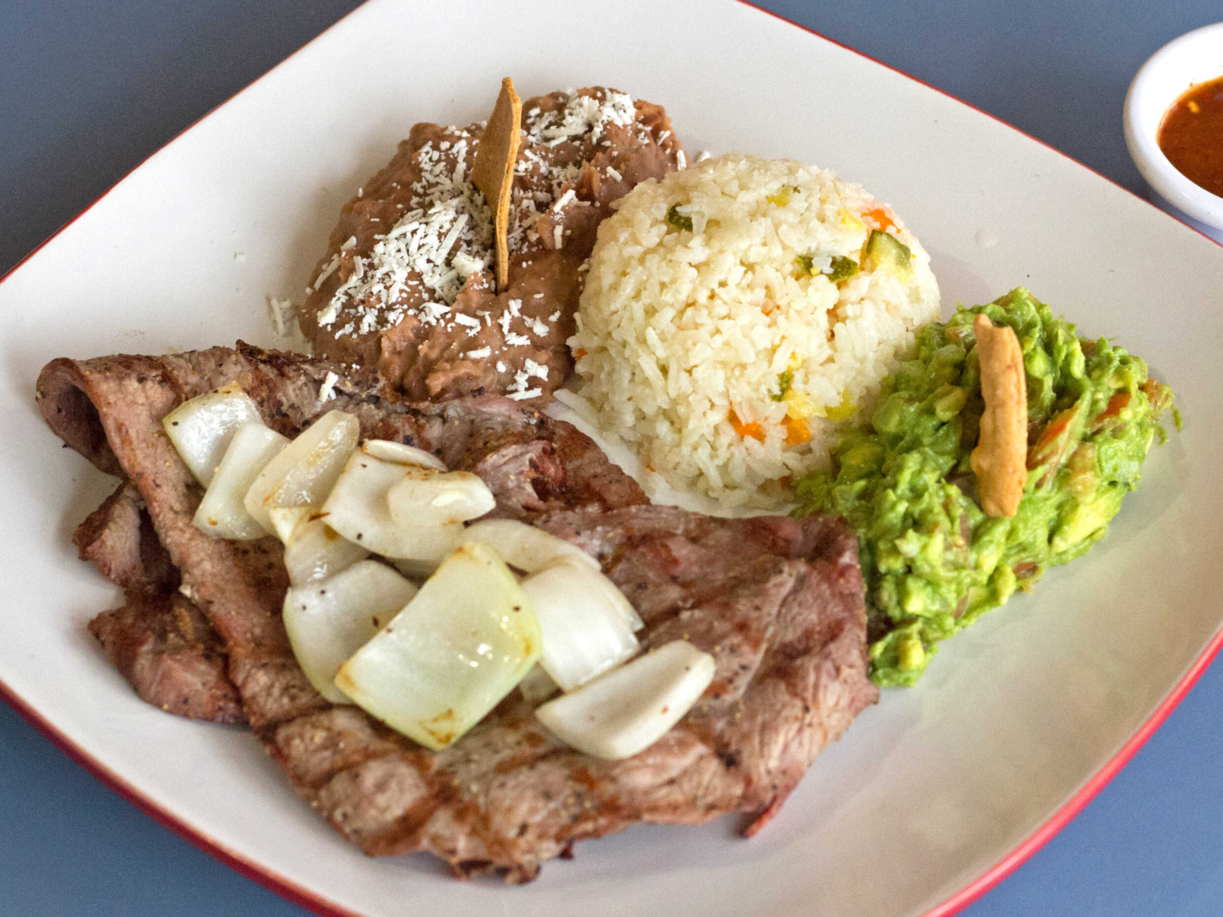 Acompañado de frijol y arroz, guacamole y cebollas asadas.