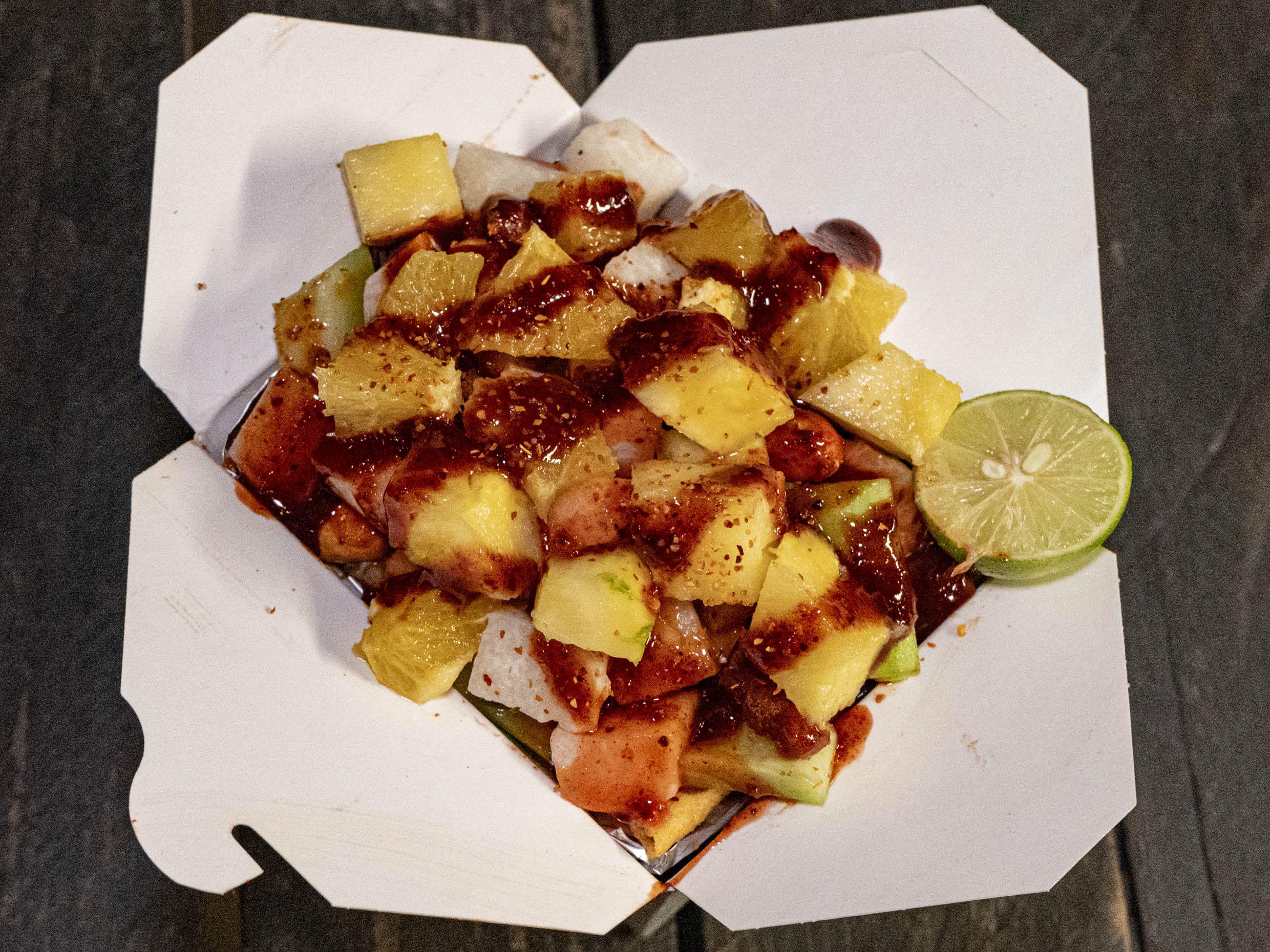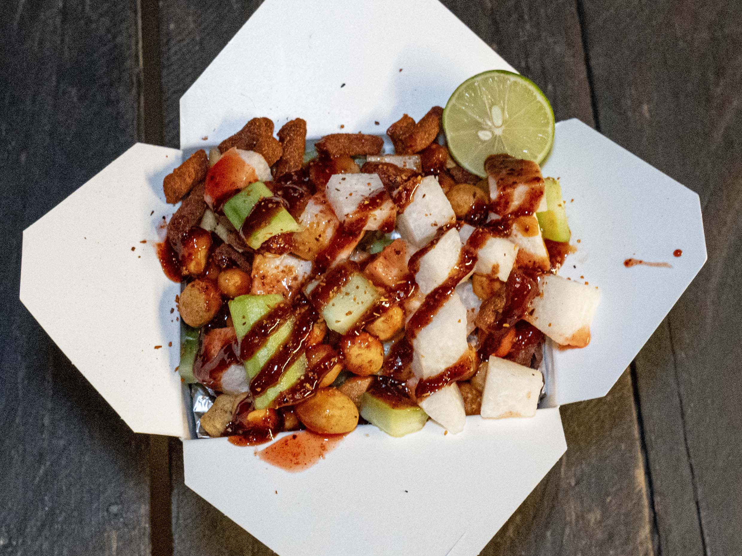 Manzana, pepino, jicama, naranja + Fruta temporada, tamarindo, chamoy, chile, tajin y limon.