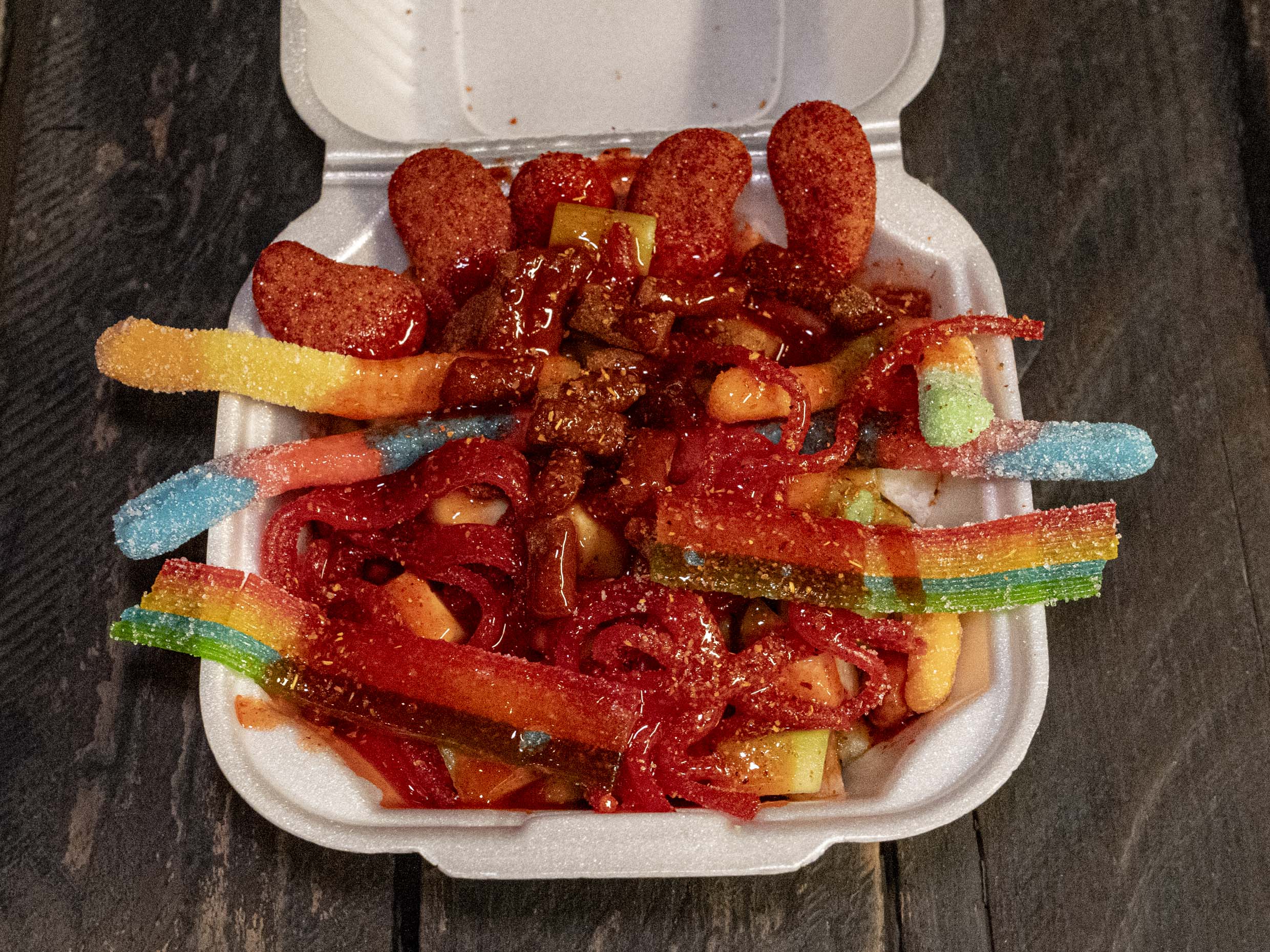 Pepino con manguitos, skwinkles, lombrinez neon, tiras extream, chacachaca, tarugos, tamarindo, chamoy, chile, tajin.