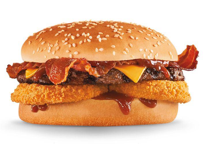 Hamburguesa de carne de res, tocino, BBQ, aros de cebolla, queso, mayonesa con papas fritas.