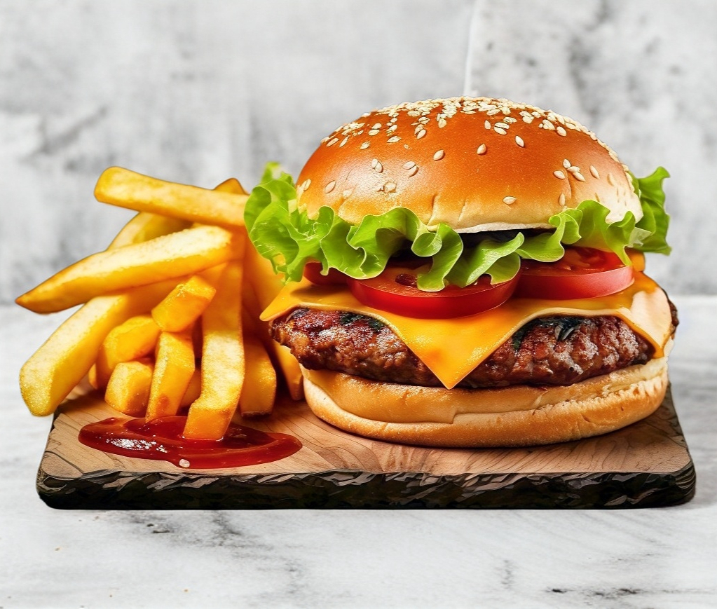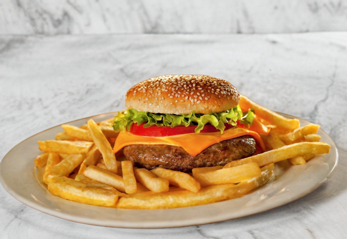 Hamburguesa con un sabor clásico, queso, pepinillos, jalapeños, cebollas, jitomate, lechuga y cátchup con papas fritas.